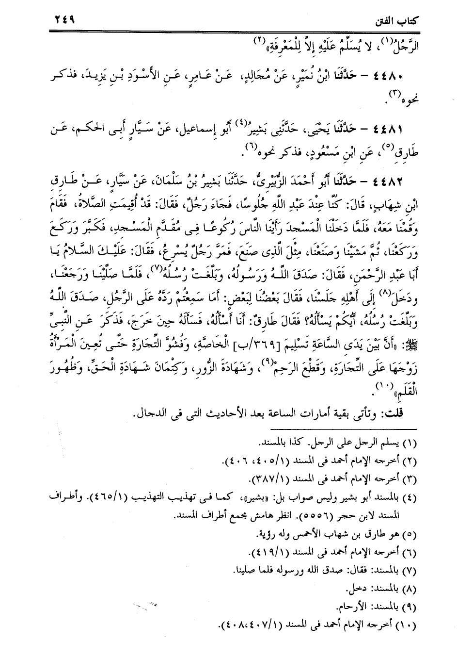 4482 - حَدَّثَنَا أَبُو أَحْمَدَ الزُّبَيْرِىُّ، حَدَّثَنَا بَشِيرُ بْنُ سَلْمَانَ، عَنْ سَيَّارٍ، عَنْ طَارِقِ ابْنِ شِهَابٍ، قَالَ: كُنَّا عِنْدَ عَبْدِ اللَّهِ جُلُوسًا، فَجَاءَ رَجُلٌ، فَقَالَ: قَدْ أُقِيمَتِ الصَّلاةُ، فَقَامَ وَقُمْنَا مَعَهُ، فَلَمَّا دَخَلْنَا الْمَسْجِدَ رَأَيْنَا النَّاسَ رُكُوعًا فِى مُقَدَّمِ الْمَسْجِدِ، فَكَبَّرَ وَرَكَعَ وَرَكَعْنَا، ثُمَّ مَشَيْنَا وَصَنَعْنَا، مِثْلَ الَّذِى صَنَعَ، فَمَرَّ رَجُلٌ يُسْرِعُ، فَقَالَ: عَلَيْكَ السَّلامُ يَا أَبَا عَبْدِ الرَّحْمَنِ، فَقَالَ: صَدَقَ اللَّهُ وَرَسُولُهُ، وَبَلَّغَتْ رُسُلُهُ، فَلَمَّا صَلَّيْنَا وَرَجَعْنَا، ودَخَلَ إِلَى أَهْلِهِ جَلَسْنَا، فَقَالَ بَعْضُنَا لِبَعْضٍ: أَمَا سَمِعْتُمْ رَدَّهُ عَلَى الرَّجُلِ، صَدَقَ اللَّهُ وَبَلَّغَتْ رُسُلُهُ، أَيُّكُمْ يَسْأَلُهُ؟ فَقَالَ طَارِقٌ: أَنَا أَسْأَلُهُ، فَسَأَلَهُ حِينَ خَرَجَ، فَذَكَرَ عَنِ النَّبِىِّ صلى الله عليه وسلم: أَنَّ بَيْنَ يَدَىِ السَّاعَةِ تَسْلِيمَ الْخَاصَّةِ، وَفُشُوَّ التِّجَارَةِ حَتَّى تُعِينَ الْمَرْأَةُ زَوْجَهَا عَلَى التِّجَارَةِ، وَقَطْعَ الرَحِمْ، وَشَهَادَةَ الزُّورِ، وَكِتْمَانَ شَهَادَةِ الْحَقِّ، وَظُهُورَ الْقَلَمِ.
