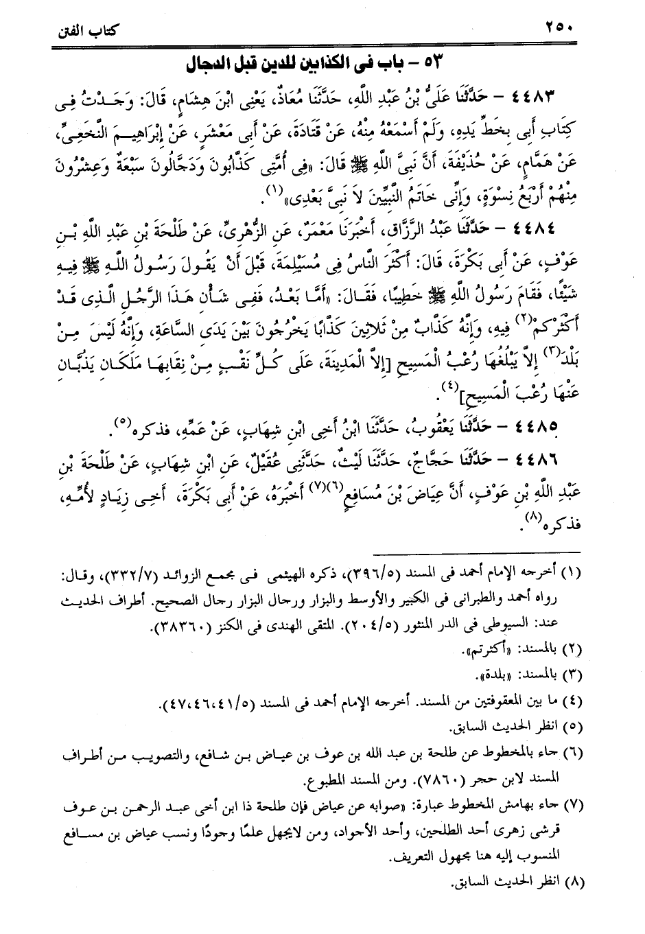 4484 - حَدَّثَنَا عَبْدُ الرَّزَّاقِ، أَخْبَرَنَا مَعْمَرٌ، عَنِ الزُّهْرِىِّ، عَنْ طَلْحَةَ بْنِ عَبْدِ اللَّهِ بْنِ عَوْفٍ، عَنْ أَبِى بَكْرَةَ، قَالَ: أَكْثَرَ النَّاسُ فِى مُسَيْلِمَةَ، قَبْلَ أَنْ يَقُولَ رَسُولُ اللَّهِ صلى الله عليه وسلم فِيهِ شَيْئًا، فَقَامَ رَسُولُ اللَّهِ صلى الله عليه وسلم خَطِيبًا، فَقَالَ: أَمَّا بَعْدُ، فَفِى شَأْنِ هَذَا الرَّجُلِ الَّذِى قَدْ أَكْثَرْكمْ فِيهِ، وَإِنَّهُ كَذَّابٌ مِنْ ثَلاثِينَ كَذَّابًا يَخْرُجُونَ بَيْنَ يَدَىِ السَّاعَةِ، وَإِنَّهُ لَيْسَ مِنْ بَلْدَ إِلاَّ يَبْلُغُهَا رُعْبُ الْمَسِيحِ [إِلاَّ الْمَدِينَةَ، عَلَى كُلِّ نَقْبٍ مِنْ نِقَابِهَا مَلَكَانِ يَذُبَّانِ عَنْهَا رُعْبَ الْمَسِيحِ] .