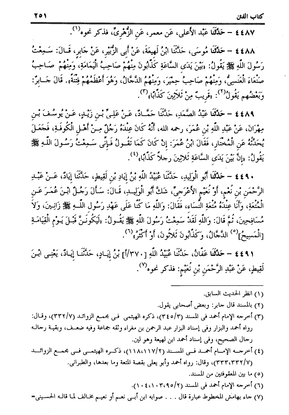 4488 - حَدَّثَنَا مُوسَى، حَدَّثَنَا ابْنُ لَهِيعَةَ، عَنْ أَبِى الزُّبَيْرِ، عَنْ جَابِرٍ، قَالَ: سَمِعْتُ رَسُولَ اللَّهِ صلى الله عليه وسلم يَقُولُ: بَيْنَ يَدَىِ السَّاعَةِ كَذَّابُونَ مِنْهُمْ صَاحِبُ الْيَمَامَةِ، وَمِنْهُمْ صَاحِبُ صَنْعَاءَ الْعَنَسِىُّ، وَمِنْهُمْ صَاحِبُ حِمْيَرَ، وَمِنْهُمُ الدَّجَّالُ، وَهُوَ أَعْظَمُهُمْ فِتْنَةً. قَالَ جَابِرٌ: وَبَعْضُهم يَقُولُ: قَرِيبٌ مِنْ ثَلاَثِينَ كَذَّابًا.