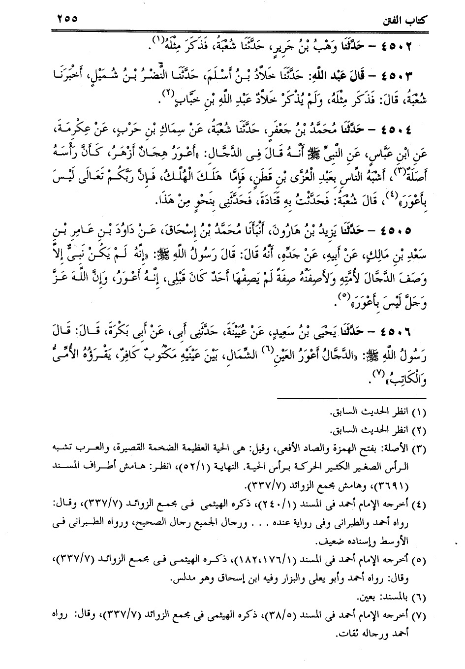 4504 - حَدَّثَنَا مُحَمَّدُ بْنُ جَعْفَرٍ، حَدَّثَنَا شُعْبَةُ، عَنْ سِمَاكِ بْنِ حَرْبٍ، عَنْ عِكْرِمَةَ، عَنِ ابْنِ عَبَّاسٍ، عَنِ النَّبِىِّ صلى الله عليه وسلم أَنَّهُ قَالَ فِى الدَّجَّالِ: أَعْوَرُ هِجَانٌ أَزْهَرُ، كَأَنَّ رَأْسَهُ أَصَلَةٌ، أَشْبَهُ النَّاسِ بِعَبْدِ الْعُزَّى بْنِ قَطَنٍ، فَإِمَّا هَلَكَ الْهُلَّكُ، فَإِنَّ رَبَّكُمْ تَعَالَى لَيْسَ بِأَعْوَرَ، قَالَ شُعْبَةُ: فَحَدَّثْتُ بِهِ قَتَادَةَ، فَحَدَّثَنِى بِنَحْوٍ مِنْ هَذَا.