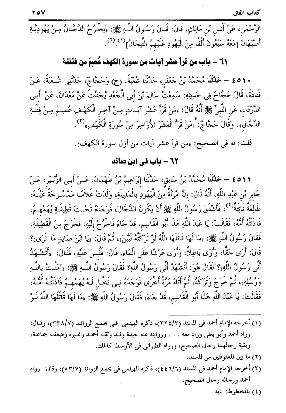 4511 - حَدَّثَنَا مُحَمَّدُ بْنُ سَابِقٍ، حَدَّثَنَا إِبْرَاهِيمُ بْنُ طَهْمَانَ، عَنْ أَبِى الزُّبَيْرِ، عَنْ جَابِرِ بْنِ عَبْدِ اللَّهِ، أَنَّهُ قَالَ: إِنَّ امْرَأَةً مِنَ الْيَهُودِ بِالْمَدِينَةِ، وَلَدَتْ غُلاَمًا مَمْسُوحَةٌ عَيْنُهُ، طَالِعَةٌ نَاتِئَةٌ، فَأَشْفَقَ رَسُولُ اللَّهِ صلى الله عليه وسلم أَنْ يَكُونَ الدَّجَّالَ، فَوَجَدَهُ تَحْتَ قَطِيفَةٍ يُهَمْهِمُ، فَآذَنَتْهُ أُمُّهُ، فَقَالَتْ: يَا عَبْدَ اللَّهِ هَذَا أَبُو الْقَاسِمِ، قَدْ جَاءَ فَاخْرُجْ إِلَيْهِ، فَخَرَجَ مِنَ الْقَطِيفَةِ، فَقَالَ رَسُولُ اللَّهِ صلى الله عليه وسلم: مَا لَهَا قَاتَلَهَا اللَّهُ لَوْ تَرَكَتْهُ لَبَيَّنَ، ثُمَّ قَالَ: يَا ابْنَ صَايدٍ مَا تَرَى؟ قَالَ: أَرَى حَقًّا، وَأَرَى بَاطِلاً، وَأَرَى عَرْشًا عَلَى الْمَاءِ، قَالَ: فَلُبِسَ عَلَيْهِ، فَقَالَ: أَتَشْهَدُ أَنِّى رَسُولُ اللَّهِ؟ فَقَالَ هُوَ: أَتَشْهَدُ أَنِّى رَسُولُ اللَّهِ؟ فَقَالَ رَسُولُ اللَّهِ صلى الله عليه وسلم: آمَنْتُ بِاللَّهِ وَرُسُلِهِ، ثُمَّ خَرَجَ وَتَرَكَهُ، ثُمَّ أَتَاهُ مَرَّةً أُخْرَى فَوَجَدَهُ فِى نَخْلٍ لَهُ يُهَمْهِمُ فَآذَنَتْهُ أُمُّهُ، فَقَالَتْ: يَا عَبْدَ اللَّهِ هَذَا أَبُو الْقَاسِمِ، قَدْ جَاءَ، فَقَالَ رَسُولُ اللَّهِ صلى الله عليه وسلم: مَا لَهَا قَاتَلَهَا اللَّهُ لَوْ -[258]- تَرَكَتْهُ لَبَيَّنَ، قَالَ: فَكَانَ رَسُولُ اللَّهِ صلى الله عليه وسلم يَطْمَعُ أَنْ يَسْمَعَ مِنْ كَلامِهِ شَيْئًا، فَيَعْلَمُ هُوَ هُوَ، أَمْ لاَ، قَالَ: يَا ابْنَ صَايِدٍ مَاذا تَرَى؟ قَالَ: أَرَى حَقًّا، وَأَرَى بَاطِلاً، وَأَرَى عَرْشًا عَلَى الْمَاءِ، قَالَ: أَتَشْهَدُ أَنِّى رَسُولُ اللَّهِ؟ قَالَ هُوَ: أَتَشْهَدُ أَنِّى رَسُولُ اللَّهِ؟ فَقَالَ رَسُولُ اللَّهِ صلى الله عليه وسلم: آمَنْتُ بِاللَّهِ وَرَسُولِهِ، فَلُبِسَ عَلَيْهِ، ثُمَّ خَرَجَ فَتَرَكَهُ، ثُمَّ جَاءَ فِى الثَّالِثَةِ، أَوِ الرَّابِعَةِ، وَمَعَهُ أَبُو بَكْرٍ وَعُمَرُ بْنُ الْخَطَّابِ فِى نَفَرٍ مِنَ الْمُهَاجِرِينَ وَالأَنْصَارِ، وَأَنَا مَعَهُ، قَالَ: فَبَادَرَ رَسُولُ اللَّهِ صلى الله عليه وسلم بَيْنَ أَيْدِينَا، وَرَجَا أَنْ يَسْمَعَ مِنْ كَلاَمِهِ شَيْئًا، فَسَبَقَتْهُ أُمُّهُ إِلَيْهِ، فَقَالَتْ: يَا عَبْدَ اللَّهِ، هَذَا أَبُو الْقَاسِمِ قَدْ جَاءَ، فَقَالَ رَسُولُ اللَّهِ صلى الله عليه وسلم: مَا لَهَا قَاتَلَهَا اللَّهُ، لَوْ تَرَكَتْهُ لَبَيَّنَ، فَقَالَ: يَا ابْنَ صَياد مَاذا تَرَى؟ قَالَ: أَرَى حَقًّا، وَأَرَى بَاطِلاً، وَأَرَى عَرْشًا عَلَى الْمَاءِ، قَالَ: أَتَشْهَدُ أَنِّى رَسُولُ اللَّهِ؟ قَالَ: أَتَشْهَدُ أَنْتَ أَنِّى رَسُولُ اللَّهِ؟ فَقَالَ رَسُولُ اللَّهِ صلى الله عليه وسلم: آمَنْتُ بِاللَّهِ وَرُسُلِهِ، فَلُبِسَ عَلَيْهِ، فَقَالَ لَهُ رَسُولُ اللَّهِ صلى الله عليه وسلم: يَا ابْنَ صَائِدٍ، إِنِى قَدْ خَبَّأْتَ لَكَ خَبِيئًا، قَالَ هُوَ الدُّخُّ الدُّخُّ، فَقَالَ لَهُ رَسُولُ اللَّهِ صلى الله عليه وسلم: اخْسَأِ اخْسَأْ، فَقَالَ عُمَرُ بْنُ الْخَطَّابِ: ائْذَنْ لِى [فَأَقْتُلَهُ يَا] رَسُولَ اللَّهِ، فَقَالَ رَسُولُ اللَّهِ صلى الله عليه وسلم: إِنْ يَكُنْ هُوَ، فَلَسْتَ صَاحِبَهُ، إِنَّمَا صَاحِبُهُ عِيسَى ابْنُ مَرْيَمَ، وَإِنْ لاَ يَكُنْ هُوَ، فَلَيْسَ لَكَ أَنْ تَقْتُلَ رَجُلاً مِنْ أَهْلِ الْعَهْدِ، قَالَ: فَلَمْ يَزَلْ رَسُولُ اللَّهِ صلى الله عليه وسلم مُشْفِقًا أَنَّهُ الدَّجَّالُ.