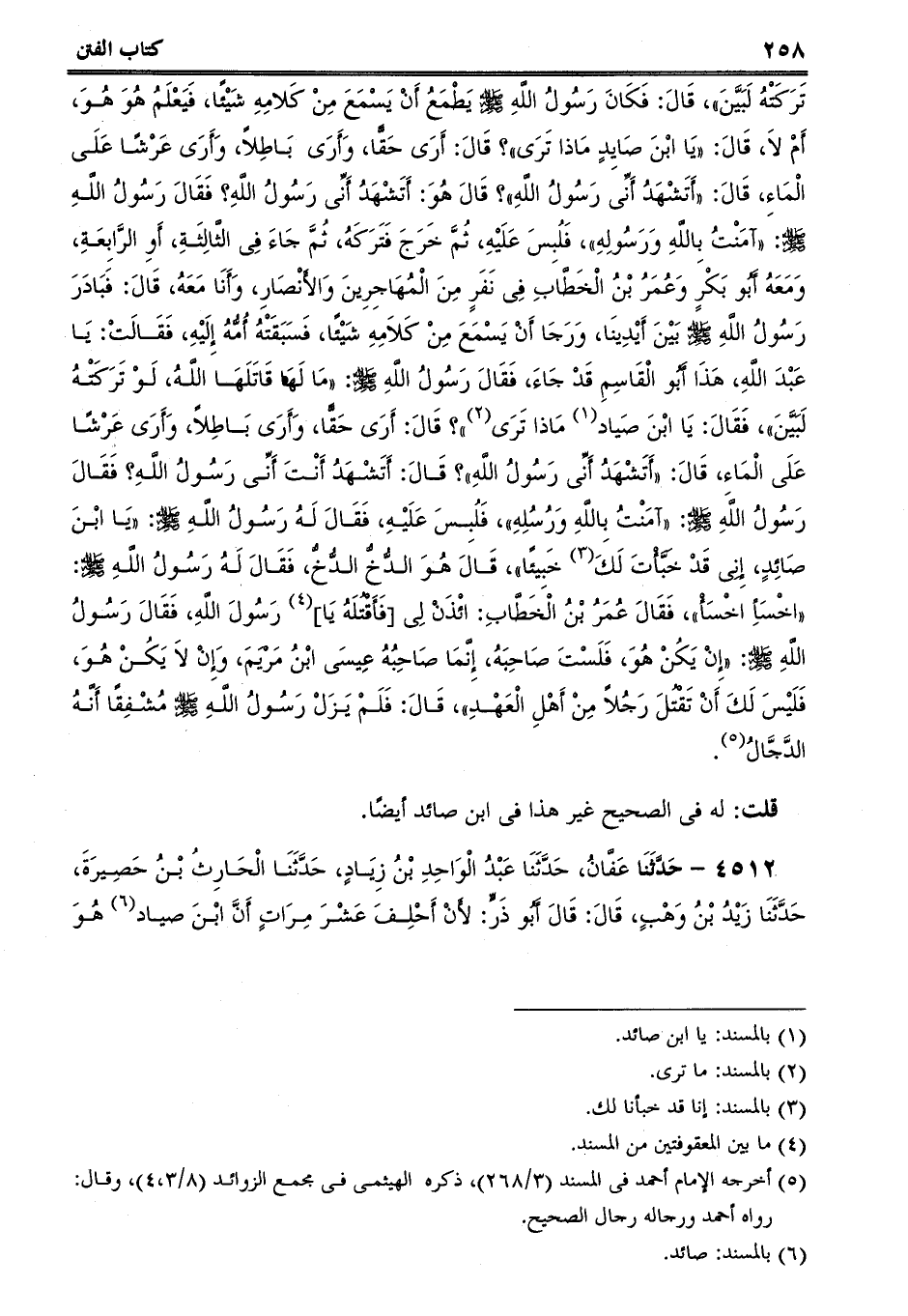 4512 - حَدَّثَنَا عَفَّانُ، حَدَّثَنَا عَبْدُ الْوَاحِدِ بْنُ زِيَادٍ، حَدَّثَنَا الْحَارِثُ بْنُ حَصِيرَةَ، حَدَّثَنَا زَيْدُ بْنُ وَهْبٍ، قَالَ: قَالَ أَبُو ذَرٍّ: لأَنْ أَحْلِفَ عَشْرَ مِرَاتٍ أَنَّ ابْنَ صياد هُوَ -[259]- الدَّجَّالُ، أَحَبُّ إِلَىَّ مِنْ أَنْ أَحْلِفَ مَرَّةً وَاحِدَةً أَنَّهُ لَيْسَ بِهِ، قَالَ: وَقال إن رَسُولُ اللَّهِ صلى الله عليه وسلم بَعَثَنِى إِلَى أُمِّهِ، قَالَ: سَلْهَا كَمْ حَمَلَتْ بِهِ؟ قَالَ: فَأَتَيْتُهَا فَسَأَلْتُهَا، فَقَالَتْ: حَمَلْتُ بِهِ اثْنَىْ عَشَرَ شَهْرًا، قَالَ: ثُمَّ أَرْسَلَنِى إِلَيْهَا، فَقَالَ: سَلْهَا عَنْ صَيْحَتِهِ حِينَ وَقَعَ؟ قَالَ: فَرَجَعْتُ إِلَيْهَا فَسَأَلْتُهَا، فَقَالَتْ: صَاحَ صَيْحَةَ الصَّبِىِّ ابْنِ شَهْرٍ، ثُمَّ قَالَ لَهُ رَسُولُ اللَّهِ صلى الله عليه وسلم: إِنِّى قَدْ خَبَأْتُ لَكَ خَبْئًا، قَالَ: خَبَأْتَ لِى خَطْمَ شَاةٍ عَفْرَاءَ وَالدُّخَانَ، قَالَ: فَأَرَادَ أَنْ يَقُولَ: الدُّخَانَ فَلَمْ يَسْتَطِعْ، فَقَالَ: الدُّخُّ الدُّخُّ، فَقَالَ رَسُولُ اللَّهِ صلى الله عليه وسلم: اخْسَأْ، فَإِنَّكَ لَنْ تَعْدُوَ قَدْرَكَ.