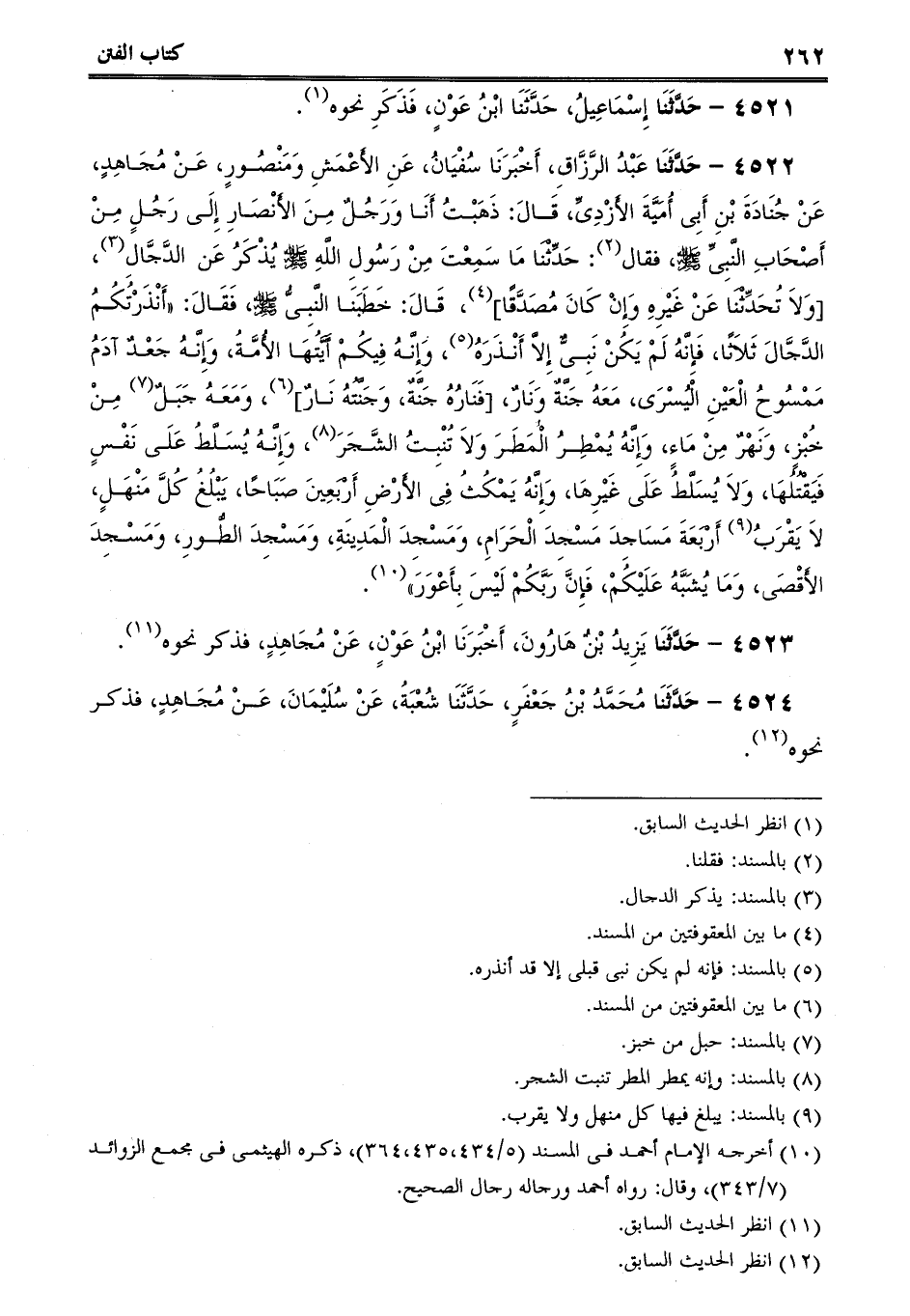 4522 - حَدَّثَنَا عَبْدُ الرَّزَّاقِ، أَخْبَرَنَا سُفْيَانُ، عَنِ الأَعْمَشِ وَمَنْصُورٍ، عَنْ مُجَاهِدٍ، عَنْ جُنَادَةَ بْنِ أَبِى أُمَيَّةَ الأَزْدِىِّ، قَالَ: ذَهَبْتُ أَنَا وَرَجُلٌ مِنَ الأَنْصَارِ إِلَى رَجُلٍ مِنْ أَصْحَابِ النَّبِىِّ صلى الله عليه وسلم، فقال: حَدِّثْنَا مَا سَمِعْتَ مِنْ رَسُولِ اللَّهِ صلى الله عليه وسلم يُذْكَرُ عَن الدَّجَّالِ، [وَلاَ تُحَدِّثْنَا عَنْ غَيْرِهِ وَإِنْ كَانَ مُصَدَّقًا] ، قَالَ: خَطَبَنَا النَّبِىُّ صلى الله عليه وسلم، فَقَالَ: أَنْذَرْتُكُمُ الدَّجَّالَ ثَلاَثًا، فَإِنَّهُ لَمْ يَكُنْ نَبِىٌّ إِلاَّ أَنْذَرَهُ، وَإِنَّهُ فِيكُمْ أَيَّتُهَا الأُمَّةُ، وَإِنَّهُ جَعْدٌ آدَمُ مَمْسُوحُ الْعَيْنِ الْيُسْرَى، مَعَهُ جَنَّةٌ وَنَارٌ، [فَنَارُهُ جَنَّةٌ، وَجَنَّتُهُ نَارٌ] ، وَمَعَهُ جَبَلٌ مِنْ خُبْزٍ، وَنَهْرٌ مِنْ مَاءٍ، وَإِنَّهُ يُمْطِرُ الْمَطَرَ وَلاَ تُنْبِتُ الشَّجَرَ، وَإِنَّهُ يُسَلَّطُ عَلَى نَفْسٍ فَيَقْتُلُهَا، وَلاَ يُسَلَّطُ عَلَى غَيْرِهَا، وَإِنَّهُ يَمْكُثُ فِى الأَرْضِ أَرْبَعِينَ صَبَاحًا، يَبْلُغُ كُلَّ مَنْهَلٍ، لاَ يَقْرَبُ أَرْبَعَةَ مَسَاجِدَ مَسْجِدَ الْحَرَامِ، وَمَسْجِدَ الْمَدِينَةِ، وَمَسْجِدَ الطُّورِ، وَمَسْجِدَ الأَقْصَى، وَمَا يُشَبَّهُ عَلَيْكُمْ، فَإِنَّ رَبَّكُمْ لَيْسَ بِأَعْوَرَ.