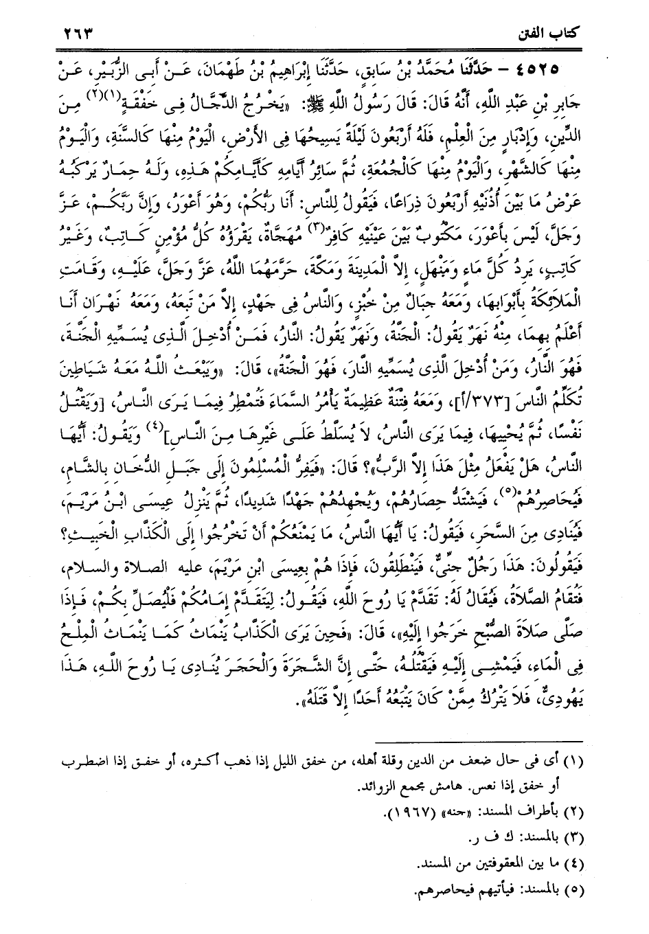 4525 - حَدَّثَنَا مُحَمَّدُ بْنُ سَابِقٍ، حَدَّثَنَا إِبْرَاهِيمُ بْنُ طَهْمَانَ، عَنْ أَبِى الزُّبَيْرِ، عَنْ جَابِرِ بْنِ عَبْدِ اللَّهِ، أَنَّهُ قَالَ: قَالَ رَسُولُ اللَّهِ صلى الله عليه وسلم: يَخْرُجُ الدَّجَّالُ فِى خَفْقَةٍ مِنَ الدِّينِ، وَإِدْبَارٍ مِنَ الْعِلْمِ، فَلَهُ أَرْبَعُونَ لَيْلَةً يَسِيحُهَا فِى الأَرْضِ، الْيَوْمُ مِنْهَا كَالسَّنَةِ، وَالْيَوْمُ مِنْهَا كَالشَّهْرِ، وَالْيَوْمُ مِنْهَا كَالْجُمُعَةِ، ثُمَّ سَائِرُ أَيَّامِهِ كَأَيَّامِكُمْ هَذِهِ، وَلَهُ حِمَارٌ يَرْكَبُهُ عَرْضُ مَا بَيْنَ أُذُنَيْهِ أَرْبَعُونَ ذِرَاعًا، فَيَقُولُ لِلنَّاسِ: أَنَا رَبُّكُمْ، وَهُوَ أَعْوَرُ، وَإِنَّ رَبَّكُمْ، عَزَّ وَجَلَّ، لَيْسَ بِأَعْوَرَ، مَكْتُوبٌ بَيْنَ عَيْنَيْهِ كَافِرٌ مُهَجَّاةٌ، يَقْرَؤُهُ كُلُّ مُؤْمِنٍ كَاتِبٌ، وَغَيْرُ كَاتِبٍ، يَرِدُ كُلَّ مَاءٍ وَمَنْهَلٍ، إِلاَّ الْمَدِينَةَ وَمَكَّةَ، حَرَّمَهُمَا اللَّهُ، عَزَّ وَجَلَّ، عَلَيْهِ، وَقَامَتِ الْمَلاَئِكَةُ بِأَبْوَابِهَا، وَمَعَهُ جِبَالٌ مِنْ خُبْزٍ، وَالنَّاسُ فِى جَهْدٍ، إِلاَّ مَنْ تَبِعَهُ، وَمَعَهُ نَهْرَانِ أَنَا أَعْلَمُ بِهِمَا، مِنْهُ نَهَرٌ يَقُولُ: الْجَنَّةُ، وَنَهَرٌ يَقُولُ: النَّارُ، فَمَنْ أُدْخِلَ الَّذِى يُسَمِّيهِ الْجَنَّةَ، فَهُوَ النَّارُ، وَمَنْ أُدْخِلَ الَّذِى يُسَمِّيهِ النَّارَ، فَهُوَ الْجَنَّةُ، قَالَ: وَيَبْعَثُ اللَّهُ مَعَهُ شَيَاطِينَ تُكَلِّمُ النَّاسَ، وَمَعَهُ فِتْنَةٌ عَظِيمَةٌ يَأْمُرُ السَّمَاءَ فَتُمْطِرُ فِيمَا يَرَى النَّاسُ، [وَيَقْتُلُ نَفْسًا، ثُمَّ يُحْيِيهَا، فِيمَا يَرَى النَّاسُ، لاَ يُسَلَّطُ عَلَى غَيْرِهَا مِنَ النَّاسِ] وَيَقُولُ: أَيُّهَا النَّاسُ، هَلْ يَفْعَلُ مِثْلَ هَذَا إِلاَّ الرَّبُّ؟ قَالَ: فَيَفِرُّ الْمُسْلِمُونَ إِلَى جَبَلِ الدُّخَانِ بِالشَّامِ، فَيُحَاصِرُهُمْ، فَيَشْتَدُّ حِصَارُهُمْ، وَيُجْهِدُهُمْ جَهْدًا شَدِيدًا، ثُمَّ يَنْزِلُ عِيسَى ابْنُ مَرْيَمَ، فَيُنَادِى مِنَ السَّحَرِ، فَيَقُولُ: يَا أَيُّهَا النَّاسُ، مَا يَمْنَعُكُمْ أَنْ تَخْرُجُوا إِلَى الْكَذَّابِ الْخَبِيثِ؟ فَيَقُولُونَ: هَذَا رَجُلٌ جِنِّىٌّ، فَيَنْطَلِقُونَ، فَإِذَا هُمْ بِعِيسَى ابْنِ مَرْيَمَ، عليه الصلاة والسلام، فَتُقَامُ الصَّلاَةُ، فَيُقَالُ لَهُ: تَقَدَّمْ يَا رُوحَ اللَّهِ، فَيَقُولُ: لِيَتَقَدَّمْ إِمَامُكُمْ فَلْيُصَلِّ بِكُمْ، فَإِذَا صَلَّى صَلاَةَ الصُّبْحِ خَرَجُوا إِلَيْهِ، قَالَ: فَحِينَ يَرَى الْكَذَّابُ يَنْمَاثُ كَمَا يَنْمَاثُ الْمِلْحُ فِى الْمَاءِ، فَيَمْشِى إِلَيْهِ فَيَقْتُلُهُ، حَتَّى إِنَّ الشَّجَرَةَ وَالْحَجَرَ يُنَادِى يَا رُوحَ اللَّهِ، هَذَا يَهُودِىٌّ، فَلاَ يَتْرُكُ مِمَّنْ كَانَ يَتْبَعُهُ أَحَدًا إِلاَّ قَتَلَهُ. -[264]-