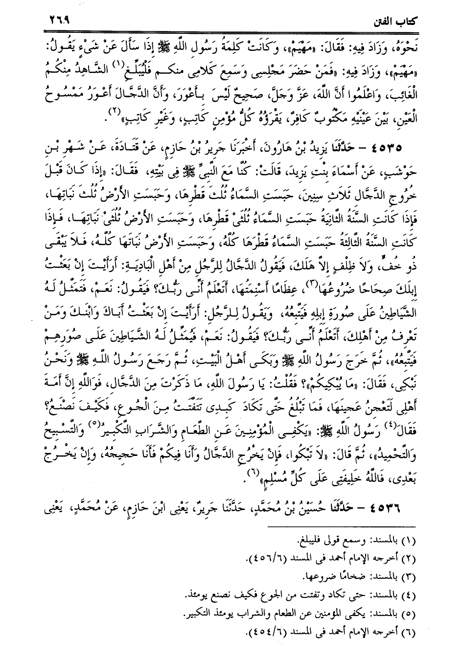 4535 - حَدَّثَنَا يَزِيدُ بْنُ هَارُونَ، أَخْبَرَنَا جَرِيرُ بْنُ حَازِمٍ، عَنْ قَتَادَةَ، عَنْ شَهْرِ بْنِ حَوْشَبٍ، عَنْ أَسْمَاءَ بِنْتِ يَزِيدَ، قَالَتْ: كُنَّا مَعَ النَّبِىِّ صلى الله عليه وسلم فِى بَيْتِهِ، فَقَالَ: إِذَا كَانَ قَبْلَ خُرُوجِ الدَّجَّالِ ثَلاَثِ سِنِينَ، حَبَسَتِ السَّمَاءُ ثُلُثَ قَطْرِهَا، وَحَبَسَتِ الأَرْضُ ثُلُثَ نَبَاتِهَا، فَإِذَا كَانَتِ السَّنَةُ الثَّانِيَةُ حَبَسَتِ السَّمَاءُ ثُلُثَىْ قَطْرِهَا، وَحَبَسَتِ الأَرْضُ ثُلُثَىْ نَبَاتِهَا، فَإِذَا كَانَتِ السَّنَةُ الثَّالِثَةُ حَبَسَتِ السَّمَاءُ قَطْرَهَا كُلَّهُ، وَحَبَسَتِ الأَرْضُ نَبَاتَهَا كُلَّهُ، فَلاَ يَبْقَى ذُو خُفٍّ، وَلاَ ظِلْفٍ إِلاَّ هَلَكَ، فَيَقُولُ الدَّجَّالُ لِلرَّجُلِ مِنْ أَهْلِ الْبَادِيَةِ: أَرَأَيْتَ إِنْ بَعَثْتُ إِبِلَكَ صِحَاحًا ضُرُوعُهَا، عِظَامًا أَسْنِمَتُهَا، أَتَعْلَمُ أَنِّى رَبُّكَ؟ فَيَقُولُ: نَعَمْ، فَتَمَثَّلُ لَهُ الشَّيَاطِينُ عَلَى صُورَةِ إِبِلِهِ فَيَتَّبِعُهُ، وَيَقُولُ لِلرَّجُلِ: أَرَأَيْتَ إِنْ بَعَثْتُ أَبَاكَ وَابْنَكَ وَمَنْ تَعْرِفُ مِنْ أَهْلِكَ، أَتَعْلَمُ أَنِّى رَبُّكَ؟ فَيَقُولُ: نَعَمْ، فَيُمَثِّلُ لَهُ الشَّيَاطِينَ عَلَى صُوَرِهِمْ فَيَتَّبِعُهُ، ثُمَّ خَرَجَ رَسُولُ اللَّهِ صلى الله عليه وسلم وَبَكَى أَهْلُ الْبَيْتِ، ثُمَّ رَجَعَ رَسُولُ اللَّهِ صلى الله عليه وسلم وَنَحْنُ نَبْكِى، فَقَالَ: مَا يُبْكِيكُمْ؟ فَقُلْتُ: يَا رَسُولَ اللَّهِ، مَا ذَكَرْتَ مِنَ الدَّجَّالِ، فَوَاللَّهِ إِنَّ أَمَةَ أَهْلِى لَتَعْجِنُ عَجِينَهَا، فَمَا تَبْلُغُ حَتَّى تَكَادَ كَبِدِى تَتَفَّتَتُ مِنَ الْجُوعِ، فَكَيْفَ نَصْنَعُ؟ فَقَالَ رَسُولُ اللَّهِ صلى الله عليه وسلم: يَكْفِى الْمُؤْمِنِينَ عَنِ الطَّعَامِ وَالشَّرَابِ التَّكْبِيرُ وَالتَّسْبِيحُ وَالتَّحْمِيدُ، ثُمَّ قَالَ: لاَ تَبْكُوا، فَإِنْ يَخْرُجِ الدَّجَّالُ وَأَنَا فِيكُمْ فَأَنَا حَجِيجُهُ، وَإِنْ يَخْرُجْ بَعْدِى، فَاللَّهُ خَلِيفَتِى عَلَى كُلِّ مُسْلِمٍ.