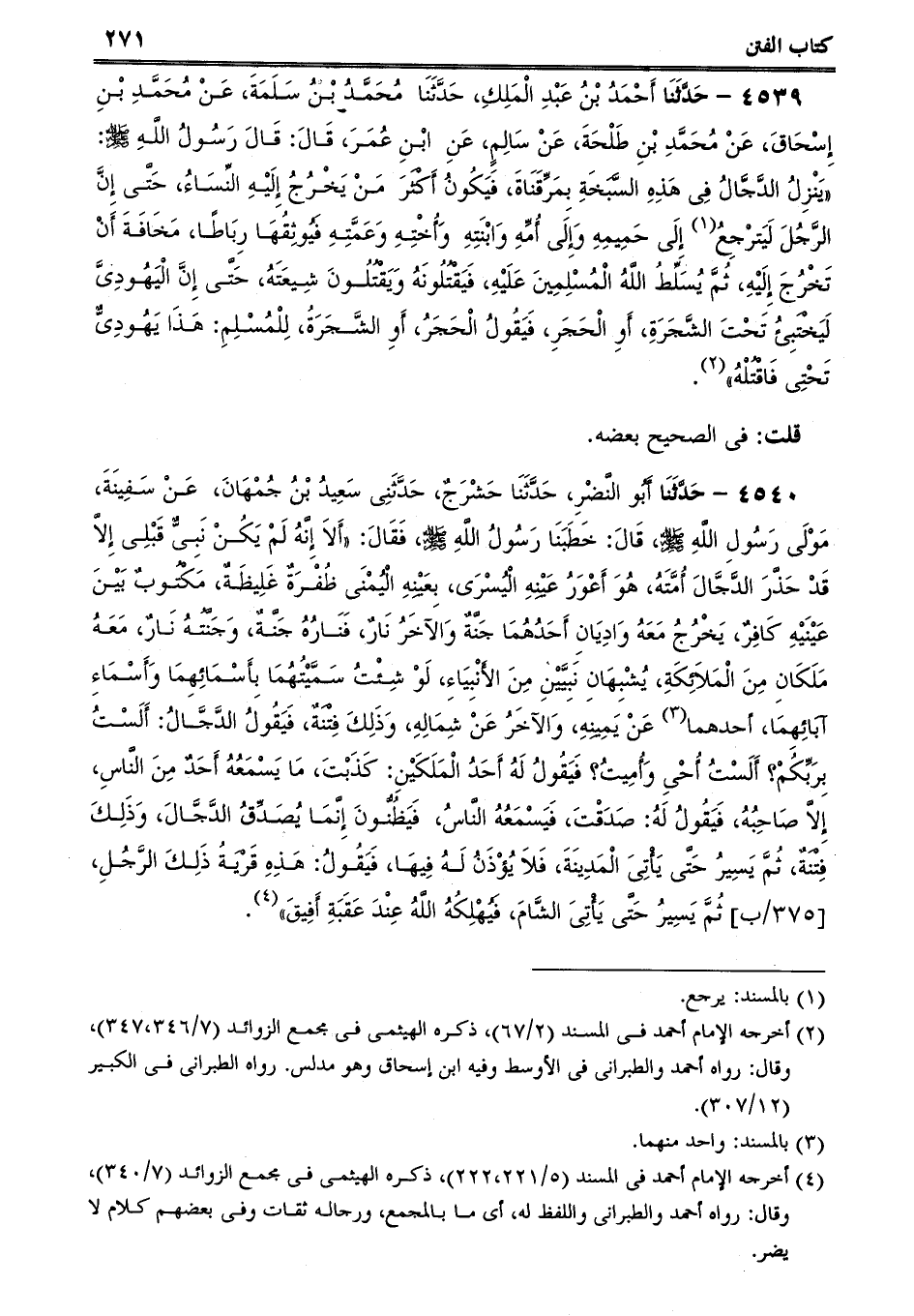 4539 - حَدَّثَنَا أَحْمَدُ بْنُ عَبْدِ الْمَلِكِ، حَدَّثَنَا مُحَمَّدُ بْنُ سَلَمَةَ، عَنْ مُحَمَّدِ بْنِ إِسْحَاقَ، عَنْ مُحَمَّدِ بْنِ طَلْحَةَ، عَنْ سَالِمٍ، عَنِ ابْنِ عُمَرَ، قَالَ: قَالَ رَسُولُ اللَّهِ صلى الله عليه وسلم: يَنْزِلُ الدَّجَّالُ فِى هَذِهِ السَّبَخَةِ بِمَرِّقَنَاةَ، فَيَكُونُ أَكْثَرَ مَنْ يَخْرُجُ إِلَيْهِ النِّسَاءُ، حَتَّى إِنَّ الرَّجُلَ لَيَترْجِعُ إِلَى حَمِيمِهِ وَإِلَى أُمِّهِ وَابْنَتِهِ وَأُخْتِهِ وَعَمَّتِهِ فَيُوثِقُهَا رِبَاطًا، مَخَافَةَ أَنْ تَخْرُجَ إِلَيْهِ، ثُمَّ يُسَلِّطُ اللَّهُ الْمُسْلِمِينَ عَلَيْهِ، فَيَقْتُلُونَهُ وَيَقْتُلُونَ شِيعَتَهُ، حَتَّى إِنَّ الْيَهُودِىَّ لَيَخْتَبِئُ تَحْتَ الشَّجَرَةِ، أَوِ الْحَجَرِ، فَيَقُولُ الْحَجَرُ، أَوِ الشَّجَرَةُ، لِلْمُسْلِمِ: هَذَا يَهُودِىٌّ تَحْتِى فَاقْتُلْهُ.