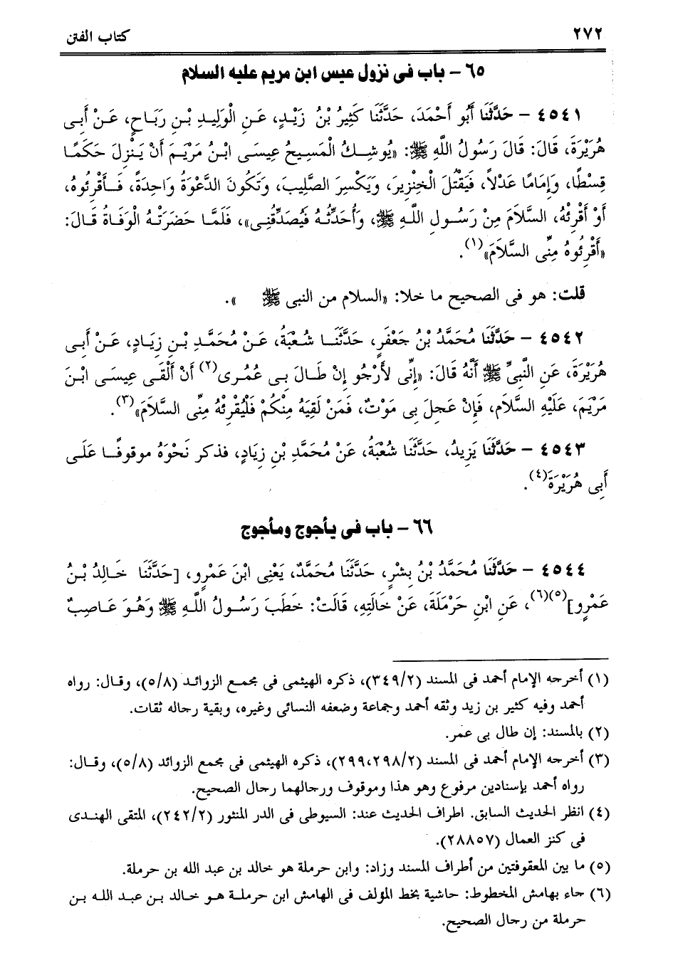 4541 - حَدَّثَنَا أَبُو أَحْمَدَ، حَدَّثَنَا كَثِيرُ بْنُ زَيْدٍ، عَنِ الْوَلِيدِ بْنِ رَبَاحٍ، عَنْ أَبِى هُرَيْرَةَ، قَالَ: قَالَ رَسُولُ اللَّهِ صلى الله عليه وسلم: يُوشِكُ الْمَسِيحُ عِيسَى ابْنُ مَرْيَمَ أَنْ يَنْزِلَ حَكَمًا قِسْطًا، وَإِمَامًا عَدْلاً، فَيَقْتُلَ الْخِنْزِيرَ، وَيَكْسِرَ الصَّلِيبَ، وَتَكُونَ الدَّعْوَةُ وَاحِدَةً، فَأَقْرِئُوهُ، أَوْ أَقْرِئْهُ، السَّلاَمَ مِنْ رَسُولِ اللَّهِ صلى الله عليه وسلم، وَأُحَدِّثُهُ فَيُصَدِّقُنِى، فَلَمَّا حَضَرَتْهُ الْوَفَاةُ قَالَ: أَقْرِئُوهُ مِنِّى السَّلاَمَ.