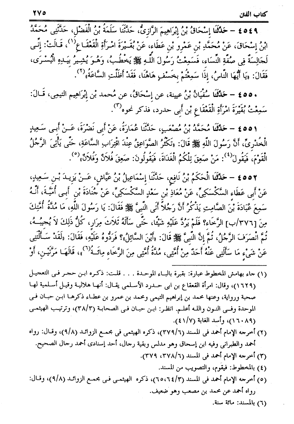 4552 - حَدَّثَنَا الْحَكَمُ بْنُ نَافِعٍ، حَدَّثَنَا إِسْمَاعِيلُ بْنُ عَيَّاشٍ، عَنْ يَزِيدَ بْنِ سَعِيدٍ، عَنْ أَبِى عَطَاءٍ السَّكْسَكِىِّ، عَنْ مُعَاذِ بْنِ سَعْدٍ السَّكْسَكِىِّ، عَنْ جُنَادَةَ بْنِ أَبِى أُمَيَّةَ، أَنَّهُ سَمِعَ عُبَادَةَ بْنَ الصَّامِتِ يَذْكُرُ أَنَّ رَجُلاً أَتَى النَّبِىَّ صلى الله عليه وسلم فَقَالَ: يَا رَسُولَ اللَّهِ، مَا مُدَّةُ أُمَّتِكَ مِنَ الرَّخَاءِ؟ فَلَمْ يَرُدَّ عَلَيْهِ شَيْئًا، حَتَّى سَأَلَهُ ثَلاَثَ مِرَارٍ، كُلُّ ذَلِكَ لاَ يُجِيبُهُ، ثُمَّ انْصَرَفَ الرَّجُلُ، ثُمَّ إِنَّ النَّبِىَّ صلى الله عليه وسلم قَالَ: أَيْنَ السَّائِلُ؟ فَرَدُّوهُ عَلَيْهِ، فَقَالَ: لَقَدْ سَأَلْتَنِى عَنْ شَىْءٍ مَا سَأَلَنِى عَنْهُ أَحَدٌ مِنْ أُمَّتِى، مُدَّةُ أُمَّتِى مِنَ الرَّخَاءِ مِائَةُ، قَالَهَا مَرَّتَيْنِ، أَوْ -[276]- ثَلاَثًا، فَقَالَ الرَّجُلُ: يَا رَسُولَ اللَّهِ، فَهَلْ لِذَلِكَ مِنْ أَمَارَةٍ أَوْ عَلاَمَةٍ أَوْ آيَةٍ؟ فَقَالَ: نَعَمِ، الْخَسْفُ وَالرَّجْفُ، وَإِرْسَالُ الشَّيَاطِينِ الْمُجَلِّبَةِ عَلَى النَّاسِ.