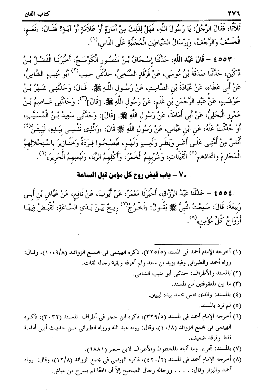 4553 - قَالَ عَبْد اللَّهِ: حَدَّثَنَا إِسْحَاقُ بْنُ مَنْصُورٍ الْكَوْسَجُ، أَخْبَرَنَا الْفَضْلُ بْنُ دُكَيْنٍ، حَدَّثَنَا صَدَقَةُ بْنُ مُوسَى، عَنْ فَرْقَدٍ السَّبَخِىِّ، حَدَّثَنَى حبيب أَبُو مُنِيبٍ الشَّامِىُّ، عَنْ أَبِى عَطَاءٍ، عَنْ عُبَادَةَ بْنِ الصَّامِتِ، عَنْ رَسُولِ اللَّهِ صلى الله عليه وسلم. قَالَ: وَحَدَّثَنِى شَهْرُ بْنُ حَوْشَبٍ، عَنْ عَبْدِ الرَّحْمَنِ بْنِ غَنْمٍ، عَنْ رَسُولِ اللَّهِ صلى الله عليه وسلم. [قَالَ] : وَحَدَّثَنِى عَاصِمُ بْنُ عَمْرٍو الْبَجَلِىُّ، عَنْ أَبِى أُمَامَةَ، عَنْ رَسُولِ اللَّهِ صلى الله عليه وسلم. [قَالَ] : وَحَدَّثَنِى سَعِيدُ بْنُ الْمُسَيَّبِ، أَوْ حُدِّثْتُ عَنْهُ، عَنِ ابْنِ عَبَّاسٍ، عَنْ رَسُولِ اللَّهِ صلى الله عليه وسلم قَالَ: وَالَّذِى نَفْسِى بِيَدِهِ، لَيَبِيتَنَّ أُنَاسٌ مِنْ أُمَّتِى عَلَى أَشَرٍ وَبَطَرٍ وَلَعِبٍ وَلَهْوٍ، فَيُصْبِحُوا قِرَدَةً وَخَنَازِيرَ بِاسْتِحْلالِهِمُ الْمَحَارِمَ واتخاذهم الْقَيْنَاتِ، وَشُرْبِهِمُ الْخَمْرَ، وَأَكْلِهِمُ الرِّبَا، وَلُبْسِهِمُ الْحَرِيرَ.