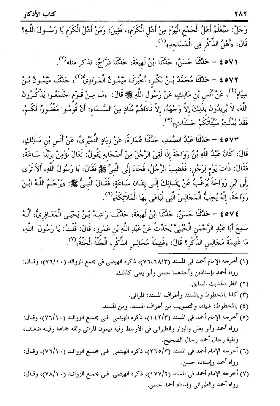 4574 - حَدَّثَنَا حَسَنٌ، حَدَّثَنَا ابْنُ لَهِيعَةَ، حَدَّثَنَا رَاشِدُ بْنُ يَحْيَى الْمَعَافِرِىُّ، أَنَّهُ سَمِعَ أَبَا عَبْدِ الرَّحْمَنِ الْحُبُلِىَّ يُحَدِّثُ عَنْ عَبْدِ اللَّهِ بْنِ عَمْرٍو، قَالَ: قُلْتُ: يَا رَسُولَ اللَّهِ، مَا غَنِيمَةُ مَجَالِسِ الذِّكْرِ؟ قَالَ: غَنِيمَةُ مَجَالِسِ الذِّكْرِ، الْجَنَّةُ الْجَنَّةُ.
