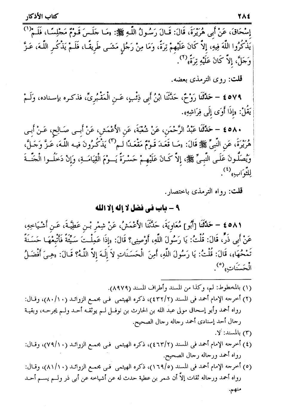 4581 - حَدَّثَنَا [أَبُو] مُعَاوِيَةَ، حَدَّثَنَا الأَعْمَشُ، عَنْ شِمْرِ بْنِ عَطِيَّةَ، عَنِ أَشْيَاخِهِ، عَنْ أَبِى ذَرٍّ، قَالَ: قُلْتُ: يَا رَسُولَ اللَّهِ، أَوْصِنِى؟ قَالَ: إِذَا عَمِلْتَ سَيِّئَةً فَأَتْبِعْهَا حَسَنَةً تَمْحُهَا، قَالَ: قُلْتُ: يَا رَسُولَ اللَّهِ، أَمِنَ الْحَسَنَاتِ لاَ إِلَهَ إِلاَّ اللَّهُ؟ قَالَ: هِىَ أَفْضَلُ الْحَسَنَاتِ.