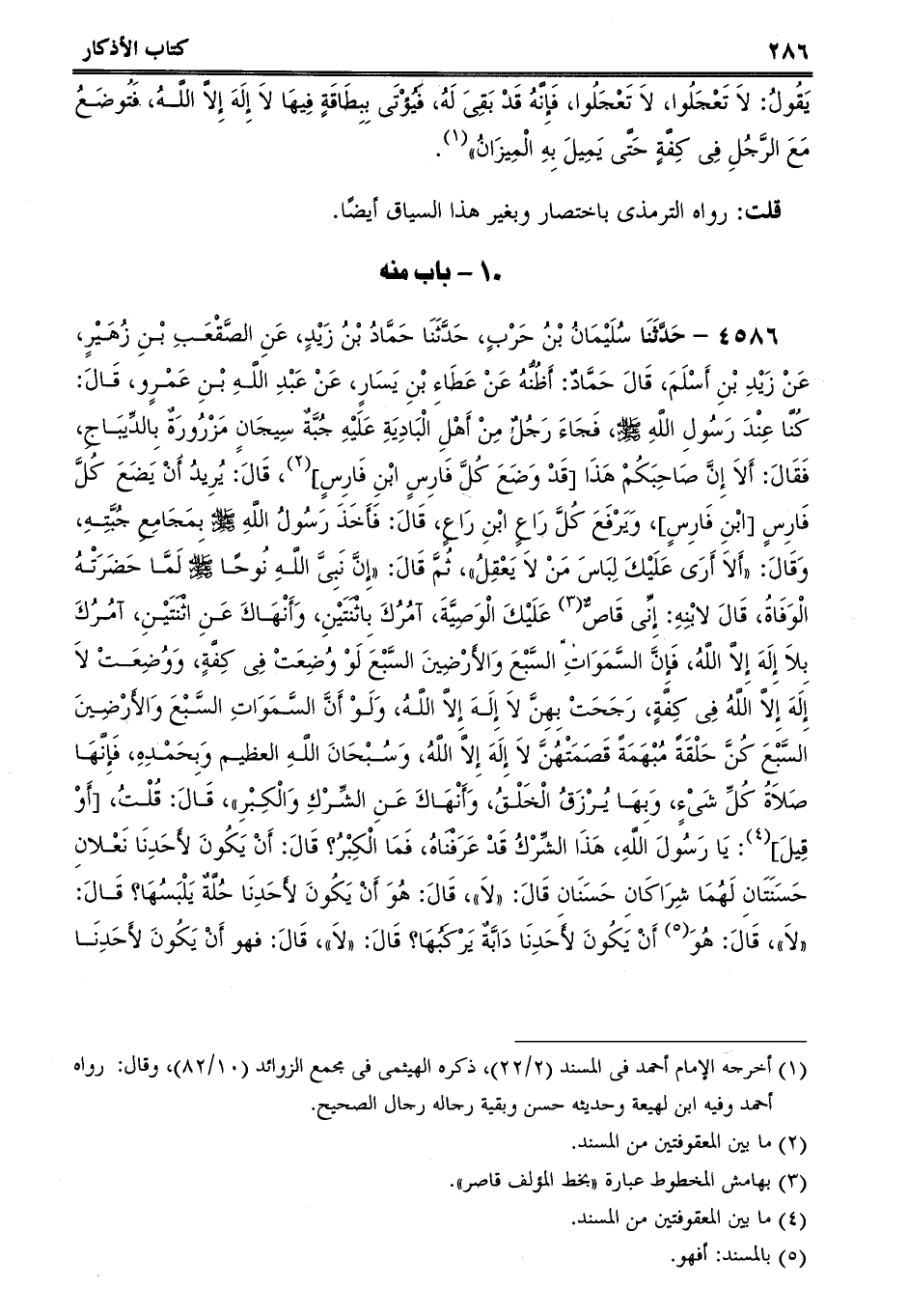 4586 - حَدَّثَنَا سُلَيْمَانُ بْنُ حَرْبٍ، حَدَّثَنَا حَمَّادُ بْنُ زَيْدٍ، عَنِ الصَّقْعَبِ بْنِ زُهَيْرٍ، عَنْ زَيْدِ بْنِ أَسْلَمَ، قَالَ حَمَّادٌ: أَظُنُّهُ عَنْ عَطَاءِ بْنِ يَسَارٍ، عَنْ عَبْدِ اللَّهِ بْنِ عَمْرٍو، قَالَ: كُنَّا عِنْدَ رَسُولِ اللَّهِ صلى الله عليه وسلم، فَجَاءَ رَجُلٌ مِنْ أَهْلِ الْبَادِيَةِ عَلَيْهِ جُبَّةٌ سِيجَانٍ مَزْرُورَةٌ بِالدِّيبَاجِ، فَقَالَ: أَلاَ إِنَّ صَاحِبَكُمْ هَذَا [قَدْ وَضَعَ كُلَّ فَارِسٍ ابْنِ فَارِسٍ] ، قَالَ: يُرِيدُ أَنْ يَضَعَ كُلَّ فَارِسٍ [ابْنِ فَارِسٍ] ، وَيَرْفَعَ كُلَّ رَاعٍ ابْنِ رَاعٍ، قَالَ: فَأَخَذَ رَسُولُ اللَّهِ صلى الله عليه وسلم بِمَجَامِعِ جُبَّتِهِ، وَقَالَ: أَلاَ أَرَى عَلَيْكَ لِبَاسَ مَنْ لاَ يَعْقِلُ، ثُمَّ قَالَ: إِنَّ نَبِىَّ اللَّهِ نُوحًا صلى الله عليه وسلم لَمَّا حَضَرَتْهُ الْوَفَاةُ، قَالَ لابْنِهِ: إِنِّى قَاصٌّ عَلَيْكَ الْوَصِيَّةَ، آمُرُكَ بِاثْنَتَيْنِ، وَأَنْهَاكَ عَنِ اثْنَتَيْنِ، آمُرُكَ بِلاَ إِلَهَ إِلاَّ اللَّهُ، فَإِنَّ السَّمَوَاتِ السَّبْعَ وَالأَرْضِينَ السَّبْعَ لَوْ وُضِعَتْ فِى كِفَّةٍ، وَوُضِعَتْ لاَ إِلَهَ إِلاَّ اللَّهُ فِى كِفَّةٍ، رَجَحَتْ بِهِنَّ لاَ إِلَهَ إِلاَّ اللَّهُ، وَلَوْ أَنَّ السَّمَوَاتِ السَّبْعَ وَالأَرْضِينَ السَّبْعَ كُنَّ حَلْقَةً مُبْهَمَةً قَصَمَتْهُنَّ لاَ إِلَهَ إِلاَّ اللَّهُ، وَسُبْحَانَ اللَّهِ العظيم وَبِحَمْدِهِ، فَإِنَّهَا صَلاَةُ كُلِّ شَىْءٍ، وَبِهَا يُرْزَقُ الْخَلْقُ، وَأَنْهَاكَ عَنِ الشِّرْكِ وَالْكِبْرِ، قَالَ: قُلْتُ، [أَوْ قِيلَ] : يَا رَسُولَ اللَّهِ، هَذَا الشِّرْكُ قَدْ عَرَفْنَاهُ، فَمَا الْكِبْرُ؟ قَالَ: أَنْ يَكُونَ لأَحَدِنَا نَعْلانِ حَسَنَتَانِ لَهُمَا شِرَاكَانِ حَسَنَانِ قَالَ: لاَ، قَالَ: هُوَ أَنْ يَكُونَ لأَحَدِنَا حُلَّةٌ يَلْبَسُهَا؟ قَالَ: لاَ، قَالَ: هُوَ أَنْ يَكُونَ لأَحَدِنَا دَابَّةٌ يَرْكَبُهَا؟ قَالَ: لاَ، قَالَ: فهو أَنْ يَكُونَ لأَحَدِنَا -[287]-