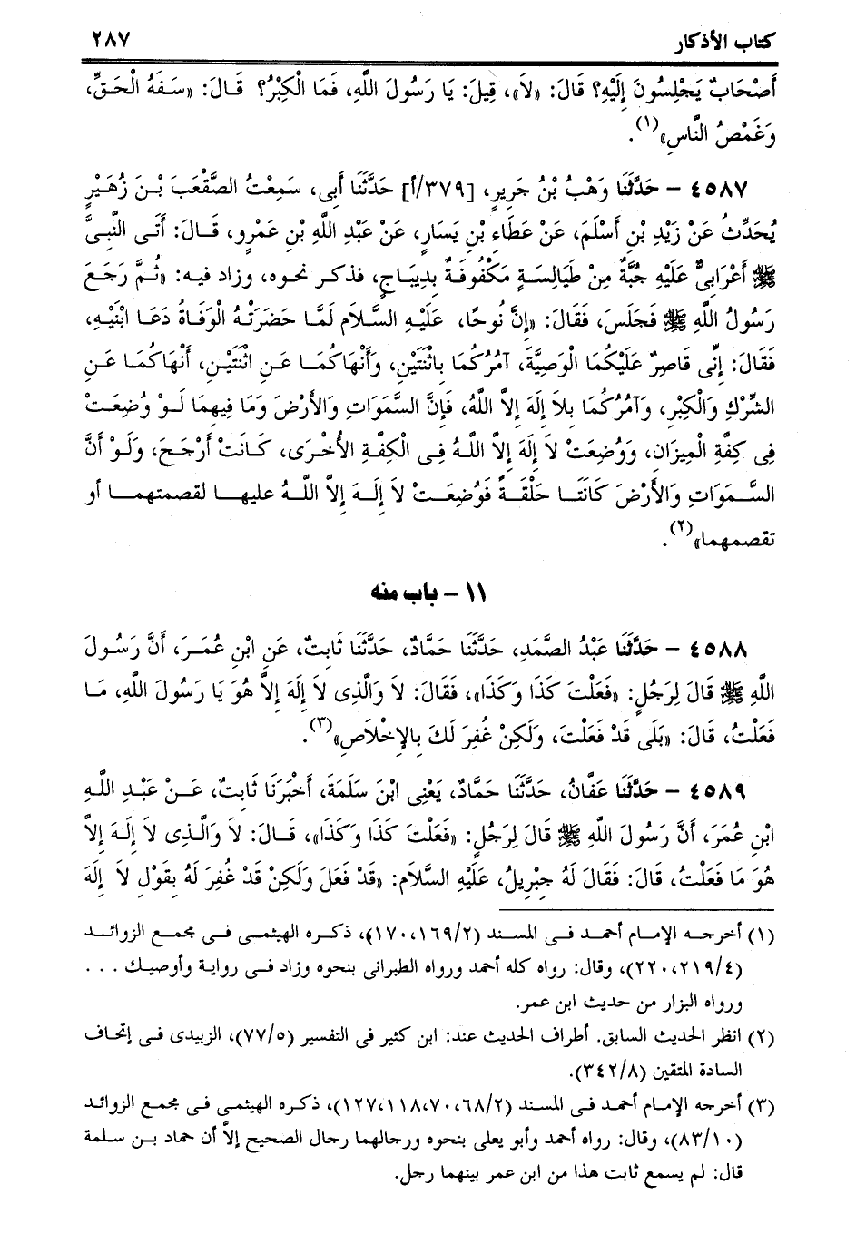 4587 - حَدَّثَنَا وَهْبُ بْنُ جَرِيرٍ، حَدَّثَنَا أَبِى، سَمِعْتُ الصَّقْعَبَ بْنَ زُهَيْرٍ يُحَدِّثُ عَنْ زَيْدِ بْنِ أَسْلَمَ، عَنْ عَطَاءِ بْنِ يَسَارٍ، عَنْ عَبْدِ اللَّهِ بْنِ عَمْرٍو، قَالَ: أَتَى النَّبِىَّ صلى الله عليه وسلم أَعْرَابِىٌّ عَلَيْهِ جُبَّةٌ مِنْ طَيَالِسَةٍ مَكْفُوفَةٌ بِدِيبَاجٍ، فذكر نحوه، وزاد فيه: ثُمَّ رَجَعَ رَسُولُ اللَّهِ صلى الله عليه وسلم فَجَلَسَ، فَقَالَ: إِنَّ نُوحًا، عَلَيْهِ السَّلاَم لَمَّا حَضَرَتْهُ الْوَفَاةُ دَعَا ابْنَيْهِ، فَقَالَ: إِنِّى قَاصِرٌ عَلَيْكُمَا الْوَصِيَّةَ، آمُرُكُمَا بِاثْنَتَيْنِ، وَأَنْهَاكُمَا عَنِ اثْنَتَيْنِ، أَنْهَاكُمَا عَنِ الشِّرْكِ وَالْكِبْرِ، وَآمُرُكُمَا بِلاَ إِلَهَ إِلاَّ اللَّهُ، فَإِنَّ السَّمَوَاتِ وَالأَرْضَ وَمَا فِيهِمَا لَوْ وُضِعَتْ فِى كِفَّةِ الْمِيزَانِ، وَوُضِعَتْ لاَ إِلَهَ إِلاَّ اللَّهُ فِى الْكِفَّةِ الأُخْرَى، كَانَتْ أَرْجَحَ، وَلَوْ أَنَّ السَّمَوَاتِ وَالأَرْضَ كَانَتَا حَلْقَةً فَوُضِعَتْ لاَ إِلَهَ إِلاَّ اللَّهُ عليها لقصمتهما أو تقصمهما.
