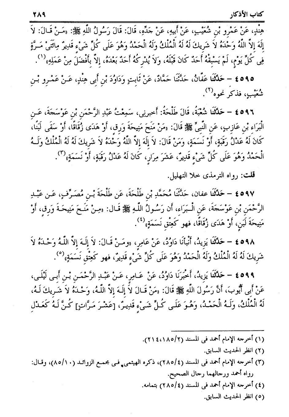 4598 - حَدَّثَنَا يَزِيدُ، أَنْبأنَا دَاوُدُ، عَنْ عَامِرٍ، ومَنْ قَالَ: لاَ إِلَهَ إِلاَّ اللَّهُ وَحْدَهُ لاَ شَرِيكَ لَهُ لَهُ الْمُلْكُ وَلَهُ الْحَمْدُ وَهُوَ عَلَى كُلِّ شَىْءٍ قَدِيرٌ، فهو كَعِتْقِ نَسَمَةٍ.