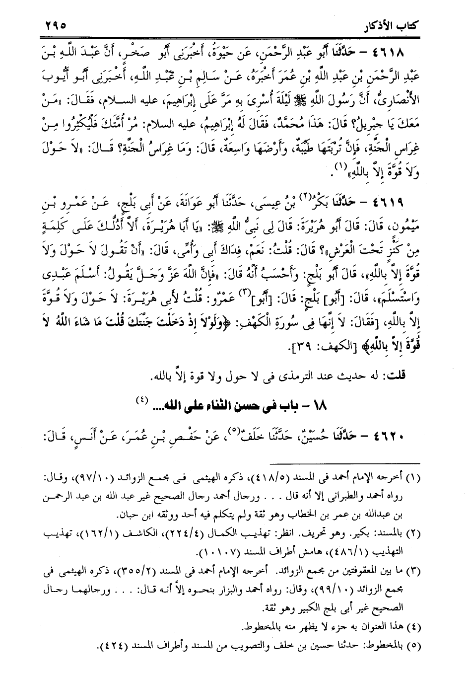4618 - حَدَّثَنَا أَبُو عَبْدِ الرَّحْمَنِ، عَن حَيْوَةُ، أَخْبَرَنِى أَبُو صَخْرٍ، أَنَّ عَبْدَ اللَّهِ بْنَ عَبْدِ الرَّحْمَنِ بْنِ عَبْدِ اللَّهِ بْنِ عُمَرَ أَخْبَرَهُ، عَنْ سَالِمِ بْنِ عَبْدِ اللَّهِ، أَخْبَرَنِى أَبُو أَيُّوبَ الأَنْصَارِىُّ، أَنَّ رَسُولَ اللَّهِ صلى الله عليه وسلم لَيْلَةَ أُسْرِىَ بِهِ مَرَّ عَلَى إِبْرَاهِيمَ، عليه السلام، فَقَالَ: مَنْ مَعَكَ يَا جِبْرِيلُ؟ قَالَ: هَذَا مُحَمَّدٌ، فَقَالَ لَهُ إِبْرَاهِيمُ، عليه السلام: مُرْ أُمَّتَكَ فَلْيُكْثِرُوا مِنْ غِرَاسِ الْجَنَّةِ، فَإِنَّ تُرْبَتَهَا طَيِّبَةٌ، وَأَرْضَهَا وَاسِعَةٌ، قَالَ: وَمَا غِرَاسُ الْجَنَّةِ؟ قَالَ: لاَ حَوْلَ وَلاَ قُوَّةَ إِلاَّ بِاللَّهِ.