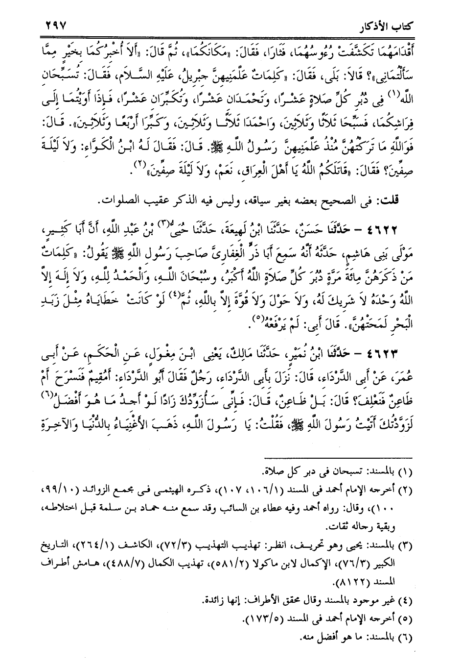 4623 - حَدَّثَنَا ابْنُ نُمَيْرٍ، حَدَّثَنَا مَالِكٌ، يَعْنِى ابْنَ مِغْوَلٍ، عَنِ الْحَكَمِ، عَنْ أَبِى عُمَرَ، عَنْ أَبِى الدَّرْدَاءِ، قَالَ: نَزَلَ بِأَبِى الدَّرْدَاءِ، رَجُلٌ فَقَالَ أَبُو الدَّرْدَاءِ: أَمُقِيمٌ فَنَسْرَحَ أَمْ ظَاعِنٌ فَنَعْلِفَ؟ قَالَ: بَلْ ظَاعِنٌ، قَالَ: فَإِنِّى سَأُزَوِّدُكَ زَادًا لَوْ أَجِدُ مَا هُوَ أَفْضَلُ لَزَوَّدْتُكَ أَتَيْتُ رَسُولَ اللَّهِ صلى الله عليه وسلم، فَقُلْتُ: يَا رَسُولَ اللَّهِ، ذَهَبَ الأَغْنِيَاءُ بِالدُّنْيَا وَالآخِرَة -[298]- ِ نُصَلِّى وَيُصَلُّونَ وَنَصُومُ وَيَصُومُونَ وَيَتَصَدَّقُونَ، وَلاَ نَتَصَدَّقُ، قَالَ: أَلاَ أَدُلُّكَ عَلَى شَىْءٍ إِنْ أَنْتَ فَعَلْتَهُ لَمْ يَسْبِقْكَ أَحَدٌ كَانَ قَبْلَكَ، وَلَمْ يُدْرِكْكَ أَحَدٌ بَعْدَكَ إِلاَّ مَنْ فَعَلَ مثل الَّذِى تَفْعَلُ دُبُرَ كُلِّ صَلاَةٍ ثَلاَثًا وَثَلاثِينَ تَسْبِيحَةً، وَحَمِدَ اللَّهَ ثَلاثًا وَثَلاَثِينَ، وَكَبَّرَ اللَّهَ ثَلاَثًا وَثَلاَثِينَ، فبلغ تِسْعٌ وَتِسْعُونَ، ثُمَّ قَالَ: تَمَامُ الْمِائَةِ لاَ إِلَهَ إِلاَّ اللَّهُ وَحْدَهُ لاَ شَرِيكَ لَهُ لَهُ الْمُلْكُ، وَلَهُ الْحَمْدُ، وَهُوَ عَلَى كُلِّ شَىْءٍ قَدِيرٌ غُفِرَ لَهُ خَطَايَاهُ، وَإِنْ كَانَتْ مِثْلَ زَبَدِ الْبَحْرِ.