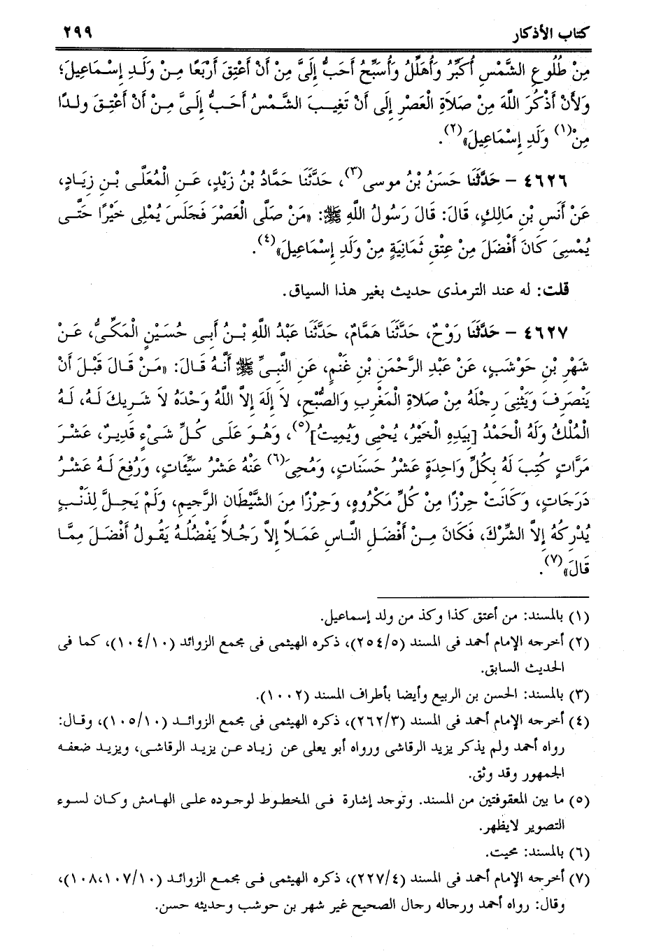 4627 - حَدَّثَنَا رَوْحٌ، حَدَّثَنَا هَمَّامٌ، حَدَّثَنَا عَبْدُ اللَّهِ بْنُ أَبِى حُسَيْنٍ الْمَكِّىُّ، عَنْ شَهْرِ بْنِ حَوْشَبٍ، عَنْ عَبْدِ الرَّحْمَنِ بْنِ غَنْمٍ، عَنِ النَّبِىِّ صلى الله عليه وسلم أَنَّهُ قَالَ: مَنْ قَالَ قَبْلَ أَنْ يَنْصَرِفَ وَيَثْنِىَ رِجْلَهُ مِنْ صَلاةِ الْمَغْرِبِ وَالصُّبْحِ، لاَ إِلَهَ إِلاَّ اللَّهُ وَحْدَهُ لاَ شَرِيكَ لَهُ، لَهُ الْمُلْكُ وَلَهُ الْحَمْدُ [بِيَدِهِ الْخَيْرُ، يُحْيِى وَيُمِيتُ] ، وَهُوَ عَلَى كُلِّ شَىْءٍ قَدِيرٌ، عَشْرَ مَرَّاتٍ كُتِبَ لَهُ بِكُلِّ وَاحِدَةٍ عَشْرُ حَسَنَاتٍ، وَمُحِىَ عَنْهُ عَشْرُ سَيِّئَاتٍ، وَرُفِعَ لَهُ عَشْرُ دَرَجَاتٍ، وَكَانَتْ حِرْزًا مِنْ كُلِّ مَكْرُوهٍ، وَحِرْزًا مِنَ الشَّيْطَانِ الرَّجِيمِ، وَلَمْ يَحِلَّ لِذَنْبٍ يُدْرِكُهُ إِلاَّ الشِّرْكَ، فَكَانَ مِنْ أَفْضَلِ النَّاسِ عَمَلاً إِلاَّ رَجُلاً يَفْضُلُهُ يَقُولُ أَفْضَلَ مِمَّا قَالَ.
