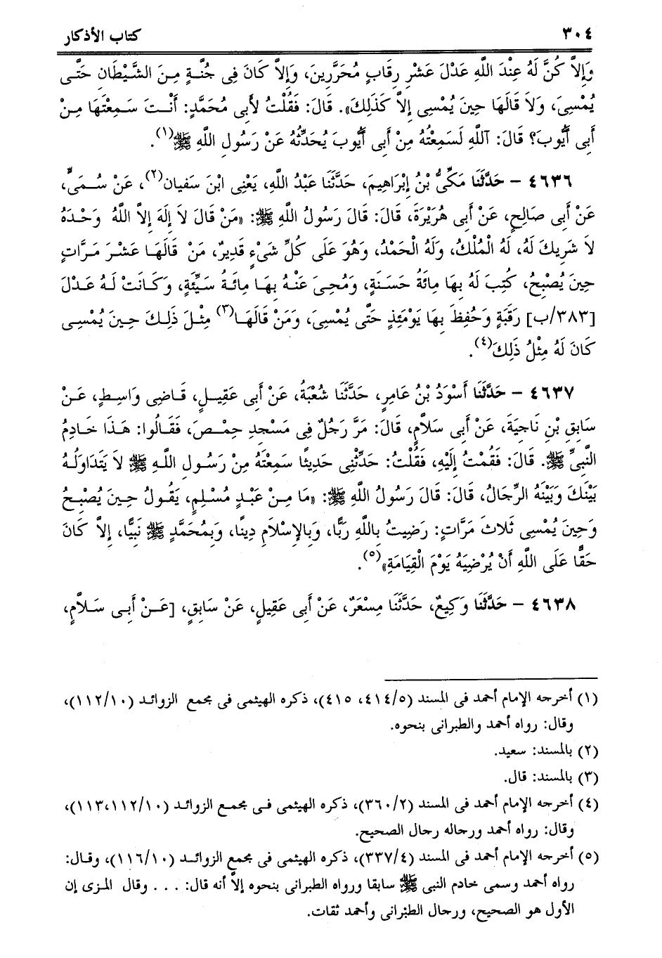 4637 - حَدَّثَنَا أَسْوَدُ بْنُ عَامِرٍ، حَدَّثَنَا شُعْبَةُ، عَنْ أَبِى عَقِيلٍ، قَاضِى وَاسِطٍ، عَنْ سَابِقِ بْنِ نَاجِيَةَ، عَنْ أَبِى سَلاَّمٍ، قَالَ: مَرَّ رَجُلٌ فِى مَسْجِدِ حِمْصَ، فَقَالُوا: هَذَا خَادِمُ النَّبِىِّ صلى الله عليه وسلم. قَالَ: فَقُمْتُ إِلَيْهِ، فَقُلْتُ: حَدِّثْنِى حَدِيثًا سَمِعْتَهُ مِنْ رَسُولِ اللَّهِ صلى الله عليه وسلم لاَ يَتَدَاوَلُهُ بَيْنَكَ وَبَيْنَهُ الرِّجَالُ، قَالَ: قَالَ رَسُولُ اللَّهِ صلى الله عليه وسلم: مَا مِنْ عَبْدٍ مُسْلِمٍ، يَقُولُ حِينَ يُصْبِحُ وَحِينَ يُمْسِى ثَلاثَ مَرَّاتٍ: رَضِيتُ بِاللَّهِ رَبًّا، وَبِالإِسْلاَمِ دِينًا، وَبِمُحَمَّدٍ صلى الله عليه وسلم نَبِيًّا، إِلاَّ كَانَ حَقًّا عَلَى اللَّهِ أَنْ يُرْضِيَهُ يَوْمَ الْقِيَامَةِ.