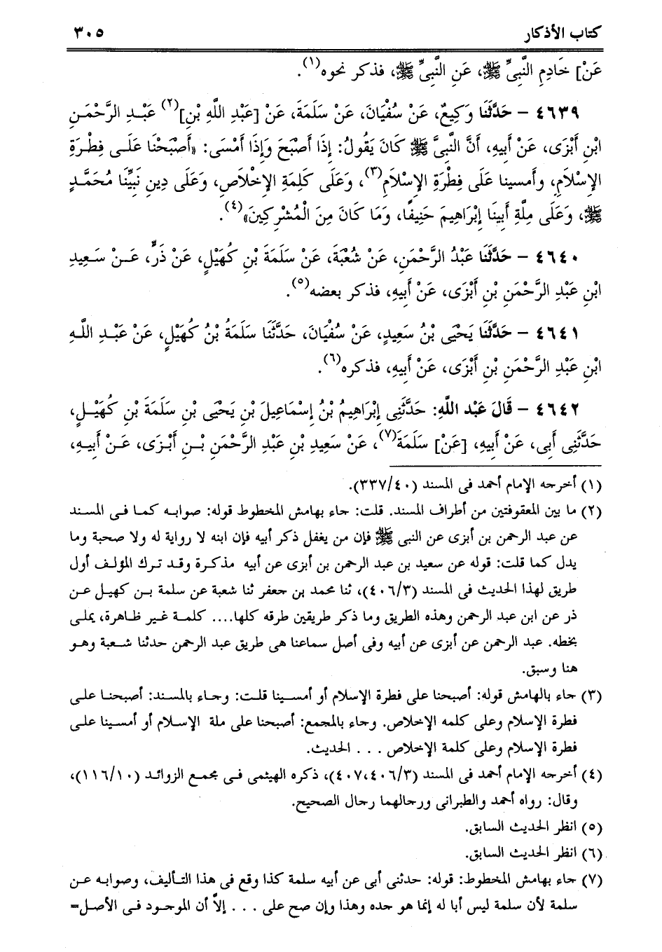 4639 - حَدَّثَنَا وَكِيعٌ، عَنْ سُفْيَانَ، عَنْ سَلَمَةَ، عَنْ [عَبْدِ اللَّهِ بْنِ] عَبْدِ الرَّحْمَنِ ابْنِ أَبْزَى، عَنْ أَبِيهِ، أَنَّ النَّبِىَّ صلى الله عليه وسلم كَانَ يَقُولُ: إِذَا أَصْبَحَ وَإِذَا أَمْسَى: أَصْبَحْنَا عَلَى فِطْرَةِ الإِسْلاَمِ، وأَمسينا عَلَى فِطْرَةِ الإِسْلاَمِ، وَعَلَى كَلِمَةِ الإِخْلاَصِ، وَعَلَى دِينِ نَبِيِّنَا مُحَمَّدٍ صلى الله عليه وسلم، وَعَلَى مِلَّةِ أَبِينَا إِبْرَاهِيمَ حَنِيفًا، وَمَا كَانَ مِنَ الْمُشْرِكِينَ.