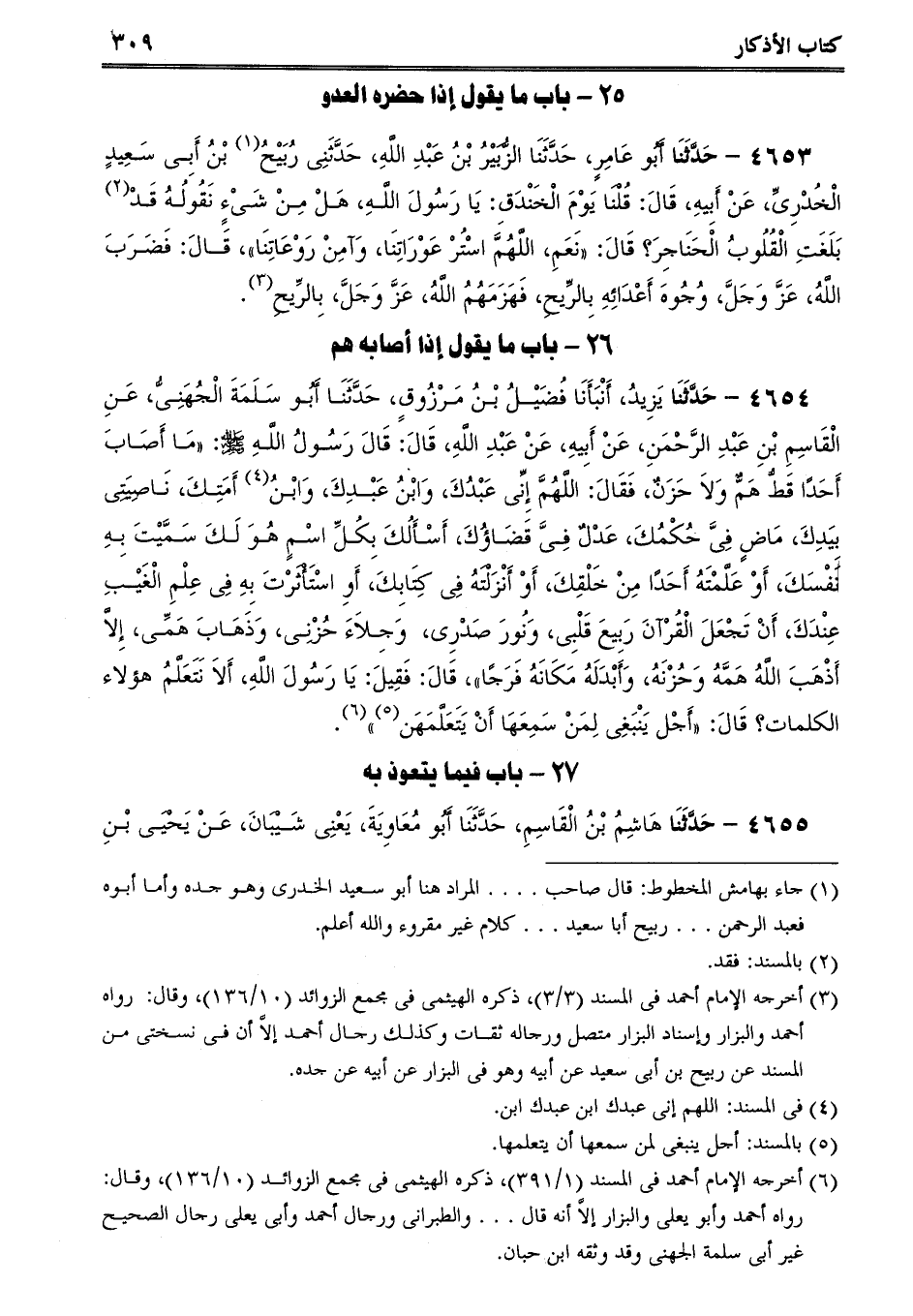 4654 - حَدَّثَنَا يَزِيدُ، أَنْبَأَنَا فُضَيْلُ بْنُ مَرْزُوقٍ، حَدَّثَنَا أَبُو سَلَمَةَ الْجُهَنِىُّ، عَنِ الْقَاسِمِ بْنِ عَبْدِ الرَّحْمَنِ، عَنْ أَبِيهِ، عَنْ عَبْدِ اللَّهِ، قَالَ: قَالَ رَسُولُ اللَّهِ صلى الله عليه وسلم: مَا أَصَابَ أَحَدًا قَطُّ هَمٌّ وَلاَ حَزَنٌ، فَقَالَ: اللَّهُمَّ إِنِّى عَبْدُكَ، وَابْنُ عَبْدِكَ، وَابْنُ أَمَتِكَ، نَاصِيَتِى بِيَدِكَ، مَاضٍ فِىَّ حُكْمُكَ، عَدْلٌ فِىَّ قَضَاؤُكَ، أَسْأَلُكَ بِكُلِّ اسْمٍ هُوَ لَكَ سَمَّيْتَ بِهِ نَفْسَكَ، أَوْ عَلَّمْتَهُ أَحَدًا مِنْ خَلْقِكَ، أَوْ أَنْزَلْتَهُ فِى كِتَابِكَ، أَوِ اسْتَأْثَرْتَ بِهِ فِى عِلْمِ الْغَيْبِ عِنْدَكَ، أَنْ تَجْعَلَ الْقُرْآنَ رَبِيعَ قَلْبِى، وَنُورَ صَدْرِى، وَجِلاَءَ حُزْنِى، وَذَهَابَ هَمِّى، إِلاَّ أَذْهَبَ اللَّهُ هَمَّهُ وَحُزْنَهُ، وَأَبْدَلَهُ مَكَانَهُ فَرَجًا، قَالَ: فَقِيلَ: يَا رَسُولَ اللَّهِ، أَلاَ نَتَعَلَّمُ هؤلاء الكلمات؟ قَالَ: أَجْل يَنْبَغِى لِمَنْ سَمِعَهَا أَنْ يَتَعَلَّمَهَن.