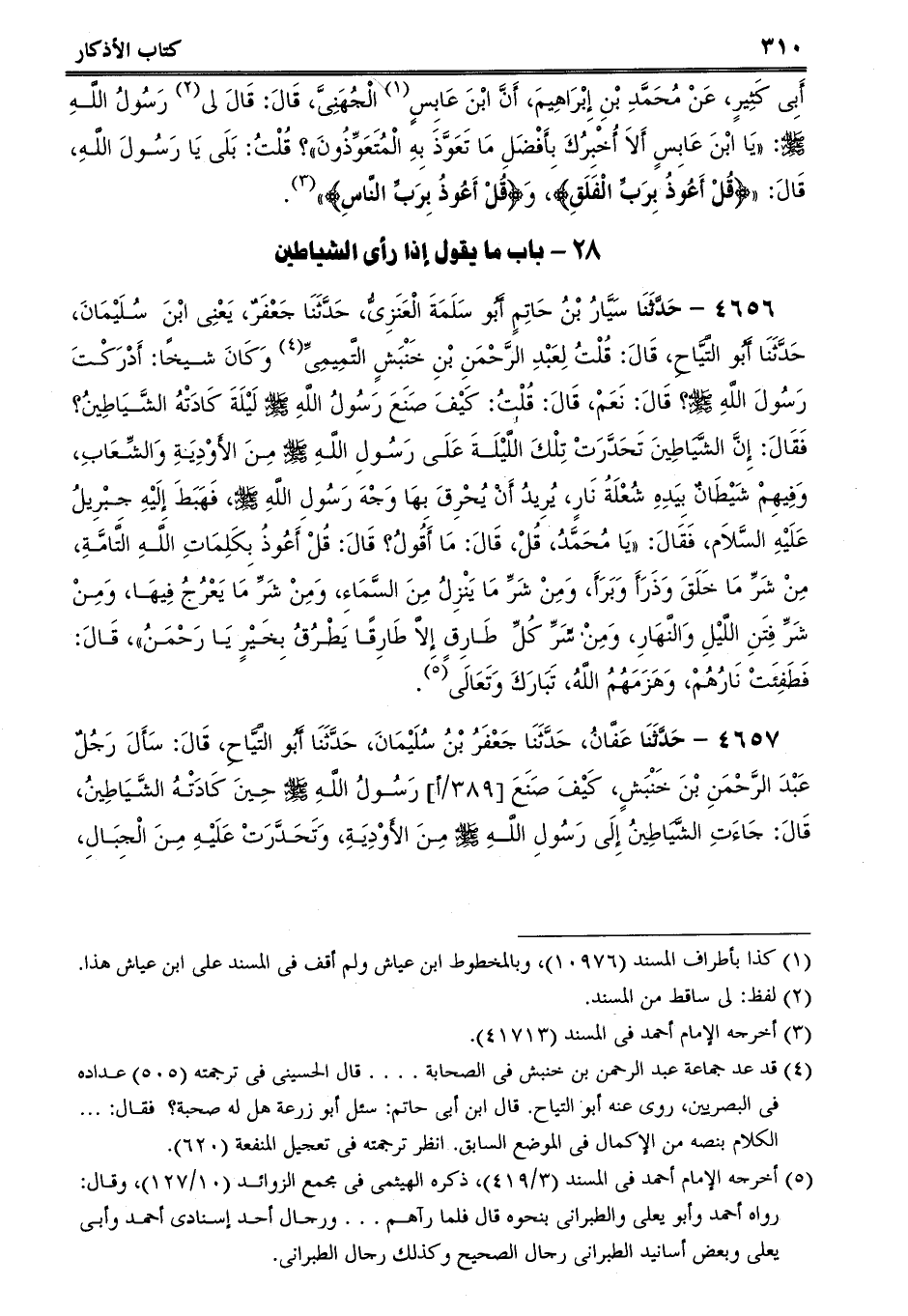 4656 - حَدَّثَنَا سَيَّارُ بْنُ حَاتِمٍ أَبُو سَلَمَةَ الْعَنَزِىُّ، حَدَّثَنَا جَعْفَرٌ، يَعْنِى ابْنَ سُلَيْمَانَ، حَدَّثَنَا أَبُو التَّيَّاحِ، قَالَ: قُلْتُ لِعَبْدِ الرَّحْمَنِ بْنِ خَنْبَشٍ التَّمِيمِىِّ وَكَانَ شيخًا: أَدْرَكْتَ رَسُولَ اللَّهِ صلى الله عليه وسلم؟ قَالَ: نَعَمْ، قَالَ: قُلْتُ: كَيْفَ صَنَعَ رَسُولُ اللَّهِ صلى الله عليه وسلم لَيْلَةَ كَادَتْهُ الشَّيَاطِينُ؟ فَقَالَ: إِنَّ الشَّيَاطِينَ تَحَدَّرَتْ تِلْكَ اللَّيْلَةَ عَلَى رَسُولِ اللَّهِ صلى الله عليه وسلم مِنَ الأَوْدِيَةِ وَالشِّعَابِ، وَفِيهِمْ شَيْطَانٌ بِيَدِهِ شُعْلَةُ نَارٍ، يُرِيدُ أَنْ يُحْرِقَ بِهَا وَجْهَ رَسُولِ اللَّهِ صلى الله عليه وسلم، فَهَبَطَ إِلَيْهِ جِبْرِيلُ عَلَيْهِ السَّلاَم، فَقَالَ: يَا مُحَمَّدُ، قُلْ، قَالَ: مَا أَقُولُ؟ قَالَ: قُلْ أَعُوذُ بِكَلِمَاتِ اللَّهِ التَّامَّةِ، مِنْ شَرِّ مَا خَلَقَ وَذَرَأَ وَبَرَأَ، وَمِنْ شَرِّ مَا يَنْزِلُ مِنَ السَّمَاءِ، وَمِنْ شَرِّ مَا يَعْرُجُ فِيهَا، وَمِنْ شَرِّ فِتَنِ اللَّيْلِ وَالنَّهَارِ، وَمِنْ شَرِّ كُلِّ طَارِقٍ إِلاَّ طَارِقًا يَطْرُقُ بِخَيْرٍ يَا رَحْمَنُ، قَالَ: فَطَفِئَتْ نَارُهُمْ، وَهَزَمَهُمُ اللَّهُ، تَبَارَكَ وَتَعَالَى.