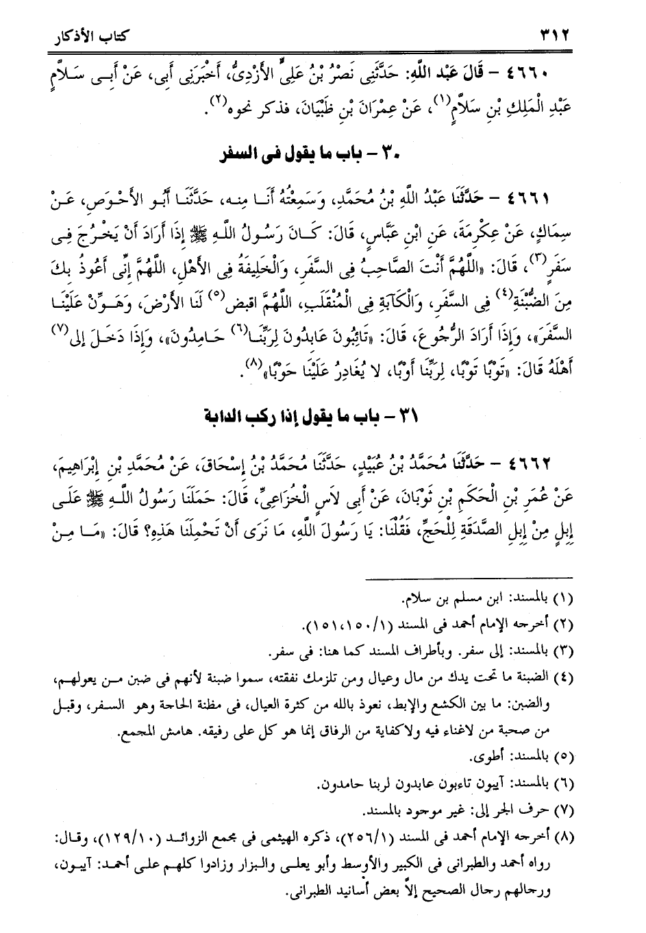 4661 - حَدَّثَنَا عَبْدُ اللَّهِ بْنُ مُحَمَّدِ، وَسَمِعْتُهُ أَنَا مِنه، حَدَّثَنَا أَبُو الأَحْوَصِ، عَنْ سِمَاكٍ، عَنْ عِكْرِمَةَ، عَنِ ابْنِ عَبَّاسٍ، قَالَ: كَانَ رَسُولُ اللَّهِ صلى الله عليه وسلم إِذَا أَرَادَ أَنْ يَخْرُجَ فِى سَفَرٍ، قَالَ: اللَّهُمَّ أَنْتَ الصَّاحِبُ فِى السَّفَرِ، وَالْخَلِيفَةُ فِى الأَهْلِ، اللَّهُمَّ إِنِّى أَعُوذُ بِكَ مِنَ الضُّبْنَةِ فِى السَّفَرِ، وَالْكَآبَةِ فِى الْمُنْقَلَبِ، اللَّهُمَّ اقبض لَنَا الأَرْضَ، وَهَوِّنْ عَلَيْنَا السَّفَرَ، وَإِذَا أَرَادَ الرُّجُوعَ، قَالَ: تَائِبُونَ عَابِدُونَ لِرَبِّنَا حَامِدُونَ، وَإِذَا دَخَلَ إلى أَهْلَهُ قَالَ: تَوْبًا تَوْبًا، لِرَبِّنَا أَوْبًا، لا يُغَادِرُ عَلَيْنَا حَوْبًا.