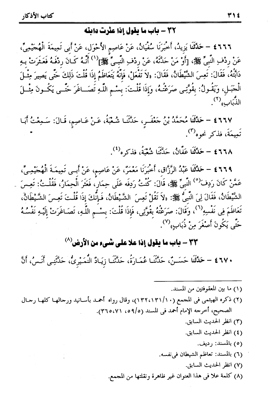 4666 - حَدَّثَنَا يَزِيدُ، أَخْبَرَنَا سُفْيَانُ، عَنْ عَاصِمٍ الأَحْوَلِ، عَنْ أَبِى تَمِيمَةَ الْهُجَيْمِىِّ، عَنْ رِدْفِ النَّبِىِّ صلى الله عليه وسلم، [أَوْ مَنْ حَدَّثَهُ، عَنْ رِدْفِ النَّبِىِّ صلى الله عليه وسلم] أَنَّهُ كَانَ رِدْفَهُ فَعَثَرَتْ بِهِ دَابَّتُهُ، فَقَالَ: تَعِسَ الشَّيْطَانُ، فَقَالَ: لاَ تَفْعَلْ، فَإِنَّهُ يَتَعَاظَمُ إِذَا قُلْتَ ذَلِكَ حَتَّى يَصِيرَ مِثْلَ الْجَبَلِ، وَيَقُولُ: بِقُوَّتِى صَرَعْتُهُ، وَإِذَا قُلْتَ: بِسْمِ اللَّهِ تَصَاغَرَ حَتَّى يَكُونَ مِثْلَ الذُّبَابِ.