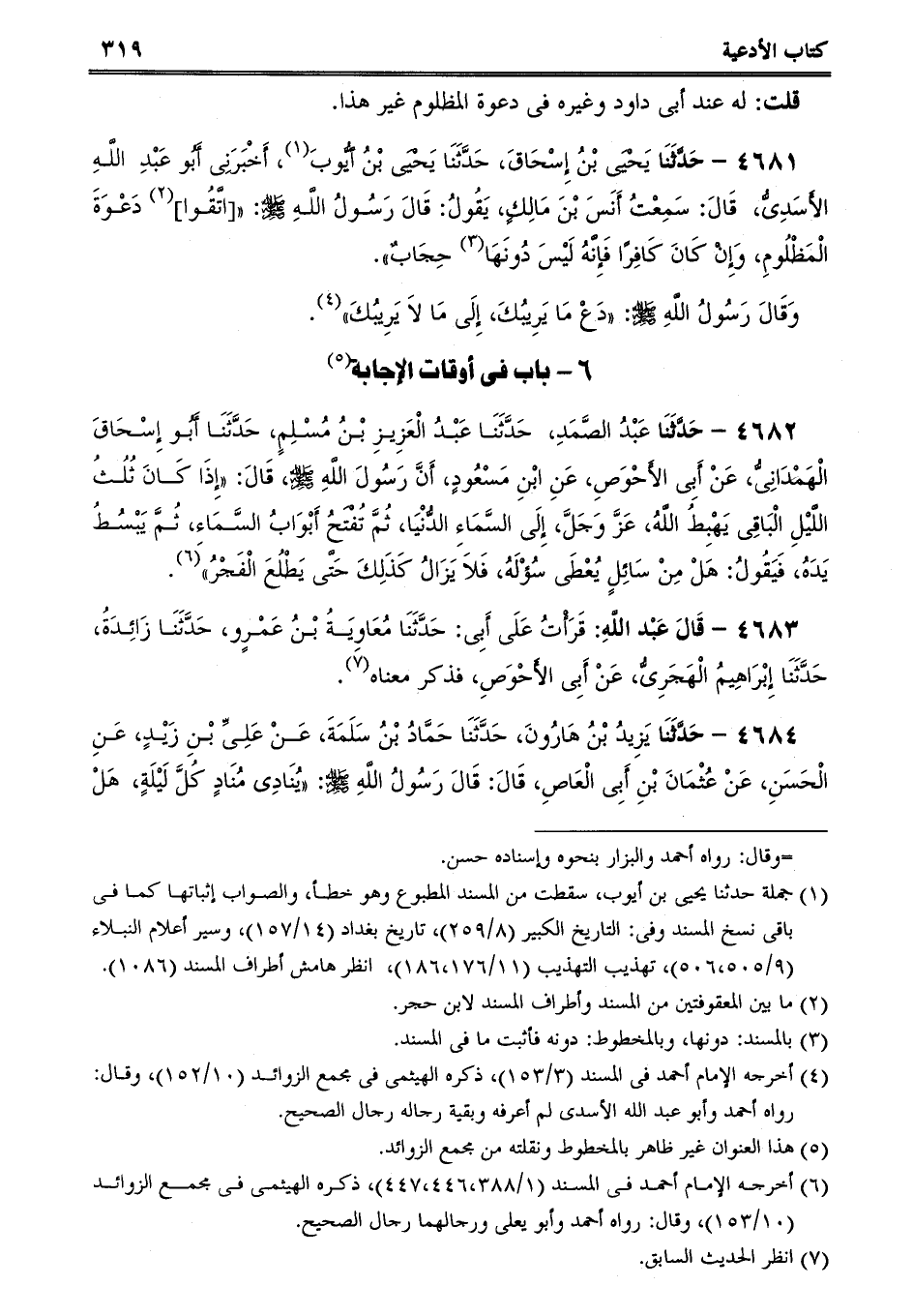 4684 - حَدَّثَنَا يَزِيدُ بْنُ هَارُونَ، حَدَّثَنَا حَمَّادُ بْنُ سَلَمَةَ، عَنْ عَلِىِّ بْنِ زَيْدٍ، عَنِ الْحَسَنِ، عَنْ عُثْمَانَ بْنِ أَبِى الْعَاصِ، قَالَ: قَالَ رَسُولُ اللَّهِ صلى الله عليه وسلم: يُنَادِى مُنَادٍ كُلَّ لَيْلَةٍ، هَلْ -[320]- مِنْ دَاعٍ فَيُسْتَجَابَ لَهُ، هَلْ مِنْ سَائِلٍ فَيُعْطَى، هَلْ مِنْ مُسْتَغْفِرٍ فَيُغْفَرَ لَهُ، حَتَّى يَنْفَجِرَ الْفَجْرُ.