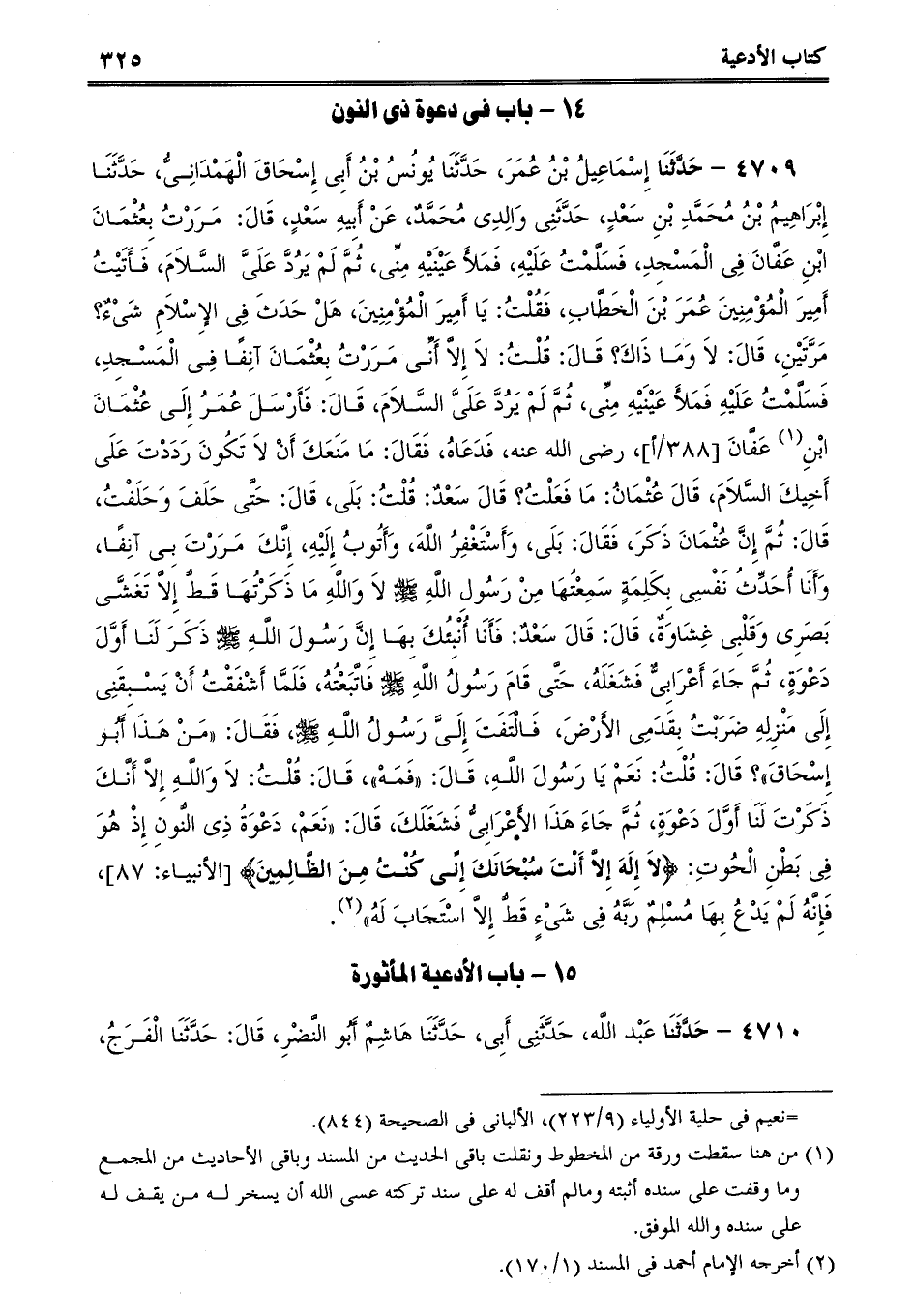4709 - حَدَّثَنَا إِسْمَاعِيلُ بْنُ عُمَرَ، حَدَّثَنَا يُونُسُ بْنُ أَبِى إِسْحَاقَ الْهَمْدَانِىُّ، حَدَّثَنَا إِبْرَاهِيمُ بْنُ مُحَمَّدِ بْنِ سَعْدٍ، حَدَّثَنِى وَالِدِى مُحَمَّدٌ، عَنْ أَبِيهِ سَعْدٍ، قَالَ: مَرَرْتُ بِعُثْمَانَ ابْنِ عَفَّانَ فِى الْمَسْجِدِ، فَسَلَّمْتُ عَلَيْهِ، فَمَلأَ عَيْنَيْهِ مِنِّى، ثُمَّ لَمْ يَرُدَّ عَلَىَّ السَّلاَمَ، فَأَتَيْتُ أَمِيرَ الْمُؤْمِنِينَ عُمَرَ بْنَ الْخَطَّابِ، فَقُلْتُ: يَا أَمِيرَ الْمُؤْمِنِينَ، هَلْ حَدَثَ فِى الإِسْلاَمِ شَىْءٌ؟ مَرَّتَيْنِ، قَالَ: لاَ وَمَا ذَاكَ؟ قَالَ: قُلْتُ: لاَ إِلاَّ أَنِّى مَرَرْتُ بِعُثْمَانَ آنِفًا فِى الْمَسْجِدِ، فَسَلَّمْتُ عَلَيْهِ فَمَلأَ عَيْنَيْهِ مِنِّى، ثُمَّ لَمْ يَرُدَّ عَلَىَّ السَّلاَمَ، قَالَ: فَأَرْسَلَ عُمَرُ إِلَى عُثْمَانَ ابْنِ عَفَّانَ، رضى الله عنه، فَدَعَاهُ، فَقَالَ: مَا مَنَعَكَ أَنْ لاَ تَكُونَ رَدَدْتَ عَلَى أَخِيكَ السَّلاَمَ، قَالَ عُثْمَانُ: مَا فَعَلْتُ؟ قَالَ سَعْدٌ: قُلْتُ: بَلَى، قَالَ: حَتَّى حَلَفَ وَحَلَفْتُ، قَالَ: ثُمَّ إِنَّ عُثْمَانَ ذَكَرَ، فَقَالَ: بَلَى، وَأَسْتَغْفِرُ اللَّهَ، وَأَتُوبُ إِلَيْهِ، إِنَّكَ مَرَرْتَ بِى آنِفًا، وَأَنَا أُحَدِّثُ نَفْسِى بِكَلِمَةٍ سَمِعْتُهَا مِنْ رَسُولِ اللَّهِ صلى الله عليه وسلم لاَ وَاللَّهِ مَا ذَكَرْتُهَا قَطُّ إِلاَّ تَغَشَّى بَصَرِى وَقَلْبِى غِشَاوَةٌ، قَالَ: قَالَ سَعْدٌ: فَأَنَا أُنْبِئُكَ بِهَا إِنَّ رَسُولَ اللَّهِ صلى الله عليه وسلم ذَكَرَ لَنَا أَوَّلَ دَعْوَةٍ، ثُمَّ جَاءَ أَعْرَابِىٌّ فَشَغَلَهُ، حَتَّى قَامَ رَسُولُ اللَّهِ صلى الله عليه وسلم فَاتَّبَعْتُهُ، فَلَمَّا أَشْفَقْتُ أَنْ يَسْبِقَنِى إِلَى مَنْزِلِهِ ضَرَبْتُ بِقَدَمِى الأَرْضَ، فَالْتَفَتَ إِلَىَّ رَسُولُ اللَّهِ صلى الله عليه وسلم، فَقَالَ: مَنْ هَذَا أَبُو إِسْحَاقَ؟ قَالَ: قُلْتُ: نَعَمْ يَا رَسُولَ اللَّهِ، قَالَ: فَمَهْ، قَالَ: قُلْتُ: لاَ وَاللَّهِ إِلاَّ أَنَّكَ ذَكَرْتَ لَنَا أَوَّلَ دَعْوَةٍ، ثُمَّ جَاءَ هَذَا الأَعْرَابِىُّ فَشَغَلَكَ، قَالَ: نَعَمْ، دَعْوَةُ ذِى النُّونِ إِذْ هُوَ فِى بَطْنِ الْحُوتِ: {لاَ إِلَهَ إِلاَّ أَنْتَ سُبْحَانَكَ إِنِّى كُنْتُ مِنَ الظَّالِمِينَ} [الأنبياء] ، فَإِنَّهُ لَمْ يَدْعُ بِهَا مُسْلِمٌ رَبَّهُ فِى شَىْءٍ قَطُّ إِلاَّ اسْتَجَابَ لَهُ.