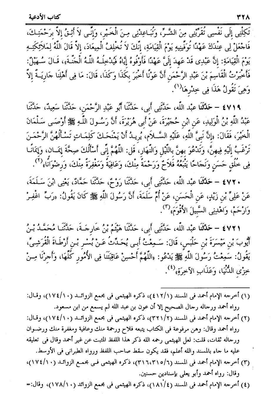 4720 - حَدَّثَنَا عبْد اللَّه، حَدَّثَنِى أَبِى، حَدَّثَنَا رَوْحٌ، حَدَّثَنَا حَمَّادٌ، يَعْنِى ابْنَ سَلَمَةَ، عَنْ عَلِىِّ بْنِ زَيْدٍ، عَنِ الْحَسَنِ، عَنْ أُمِّ سَلَمَةَ، أَنَّ رَسُولَ اللَّهِ صلى الله عليه وسلم كَانَ يَقُولُ: رَبِّ اغْفِرْ وَارْحَمْ، وَاهْدِنِى السَّبِيلَ الأَقْوَمَ.