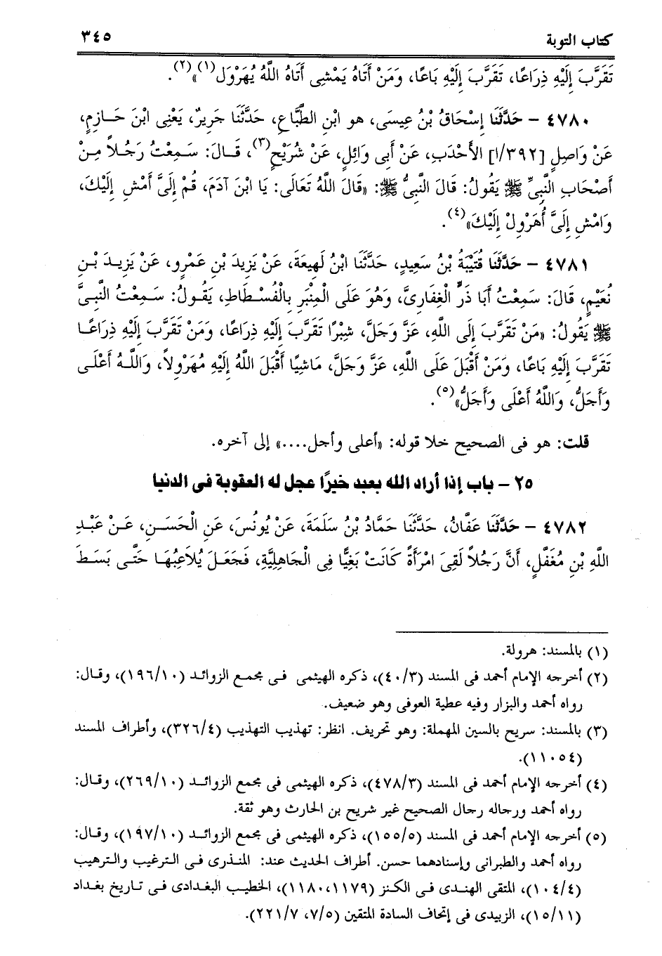 4781 - حَدَّثَنَا قُتَيْبَةُ بْنُ سَعِيدٍ، حَدَّثَنَا ابْنُ لَهِيعَةَ، عَنْ يَزِيدَ بْنِ عَمْرٍو، عَنْ يَزِيدَ بْنِ نُعَيْمٍ، قَالَ: سَمِعْتُ أَبَا ذَرٍّ الْغِفَارِىَّ، وَهُوَ عَلَى الْمِنْبَرِ بِالْفُسْطَاطِ، يَقُولُ: سَمِعْتُ النَّبِىَّ صلى الله عليه وسلم يَقُولُ: مَنْ تَقَرَّبَ إِلَى اللَّهِ، عَزَّ وَجَلَّ، شِبْرًا تَقَرَّبَ إِلَيْهِ ذِرَاعًا، وَمَنْ تَقَرَّبَ إِلَيْهِ ذِرَاعًا تَقَرَّبَ إِلَيْهِ بَاعًا، وَمَنْ أَقْبَلَ عَلَى اللَّهِ، عَزَّ وَجَلَّ، مَاشِيًا أَقْبَلَ اللَّهُ إِلَيْهِ مُهَرْوِلاً، وَاللَّهُ أَعْلَى وَأَجَلُّ، وَاللَّهُ أَعْلَى وَأَجَلُّ.