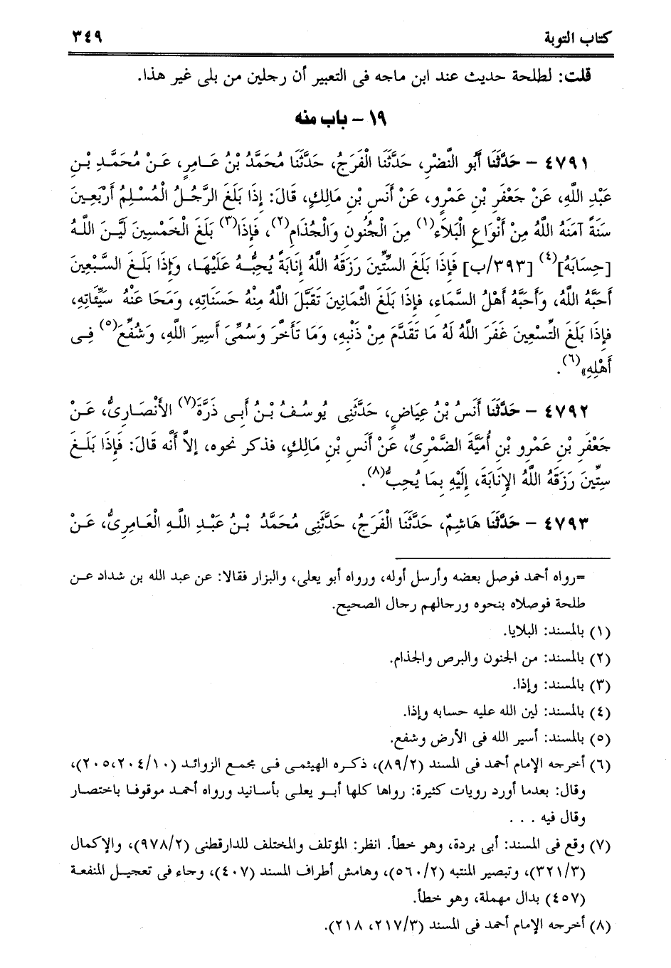 4791 - حَدَّثَنَا أَبُو النَّضْرِ، حَدَّثَنَا الْفَرَجُ، حَدَّثَنَا مُحَمَّدُ بْنُ عَامِرٍ، عَنْ مُحَمَّدِ بْنِ عَبْدِ اللَّهِ، عَنْ جَعْفَرِ بْنِ عَمْرٍو، عَنْ أَنَسِ بْنِ مَالِكٍ، قَالَ: إِذَا بَلَغَ الرَّجُلُ الْمُسْلِمُ أَرْبَعِينَ سَنَةً آمَنَهُ اللَّهُ مِنْ أَنْوَاعِ الْبَلاَء مِنَ الْجُنُونِ وَالْجُذَامِ، فَإِذَا بَلَغَ الْخَمْسِينَ لَيَّنَ اللَّهُ [حِسَابَهُ] فَإِذَا بَلَغَ السِّتِّينَ رَزَقَهُ اللَّهُ إِنَابَةً يُحِبُّهُ عَلَيْهَا، وَإِذَا بَلَغَ السَّبْعِينَ أَحَبَّهُ اللَّهُ، وَأَحَبَّهُ أَهْلُ السَّمَاءِ، فإِذَا بَلَغَ الثَّمَانِينَ تَقَبَّلَ اللَّهُ مِنْهُ حَسَنَاتِهِ، وَمَحَا عَنْهُ سَيِّئَاتِهِ، فإِذَا بَلَغَ التِّسْعِينَ غَفَرَ اللَّهُ لَهُ مَا تَقَدَّمَ مِنْ ذَنْبِهِ، وَمَا تَأَخَّرَ وَسُمِّىَ أَسِيرَ اللَّهِ، وَشُفِّعَ فِى أَهْلِهِ.