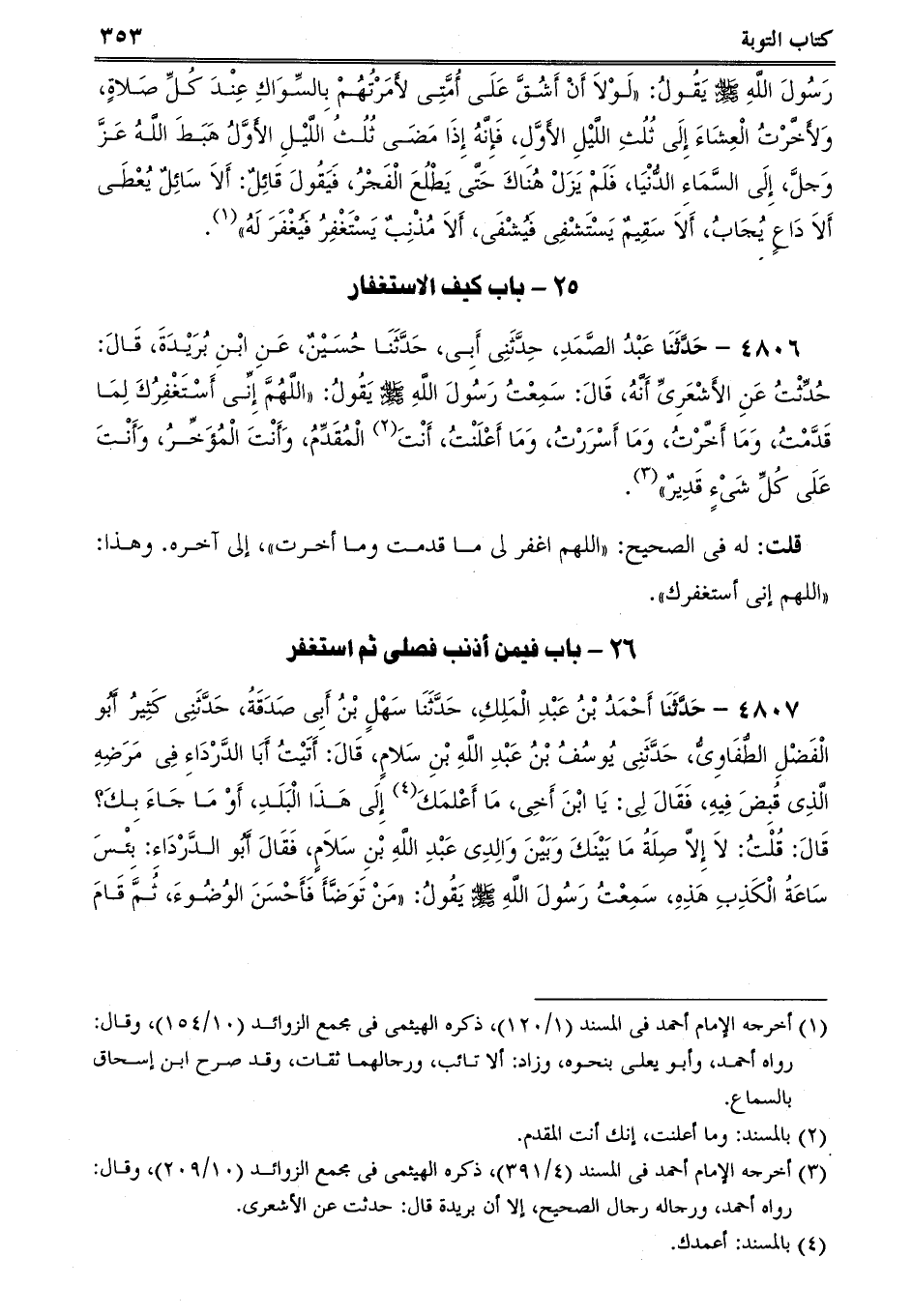 4806 - حَدَّثَنَا عَبْدُ الصَّمَدِ، حِدَّثَنِى أَبِى، حَدَّثَنَا حُسَيْنٌ، عَنِ ابْنِ بُرَيْدَةَ، قَالَ: حُدِّثْتُ عَنِ الأَشْعَرِىِّ أَنَّهُ، قَالَ: سَمِعْتُ رَسُولَ اللَّهِ صلى الله عليه وسلم يَقُولُ: اللَّهُمَّ إِنِّى أَسْتَغْفِرُكَ لِمَا قَدَّمْتُ، وَمَا أَخَّرْتُ، وَمَا أَسْرَرْتُ، وَمَا أَعْلَنْتُ، أَنْتَ الْمُقَدِّمُ، وَأَنْتَ الْمُؤَخِّرُ، وَأَنْتَ عَلَى كُلِّ شَىْءٍ قَدِيرٌ.