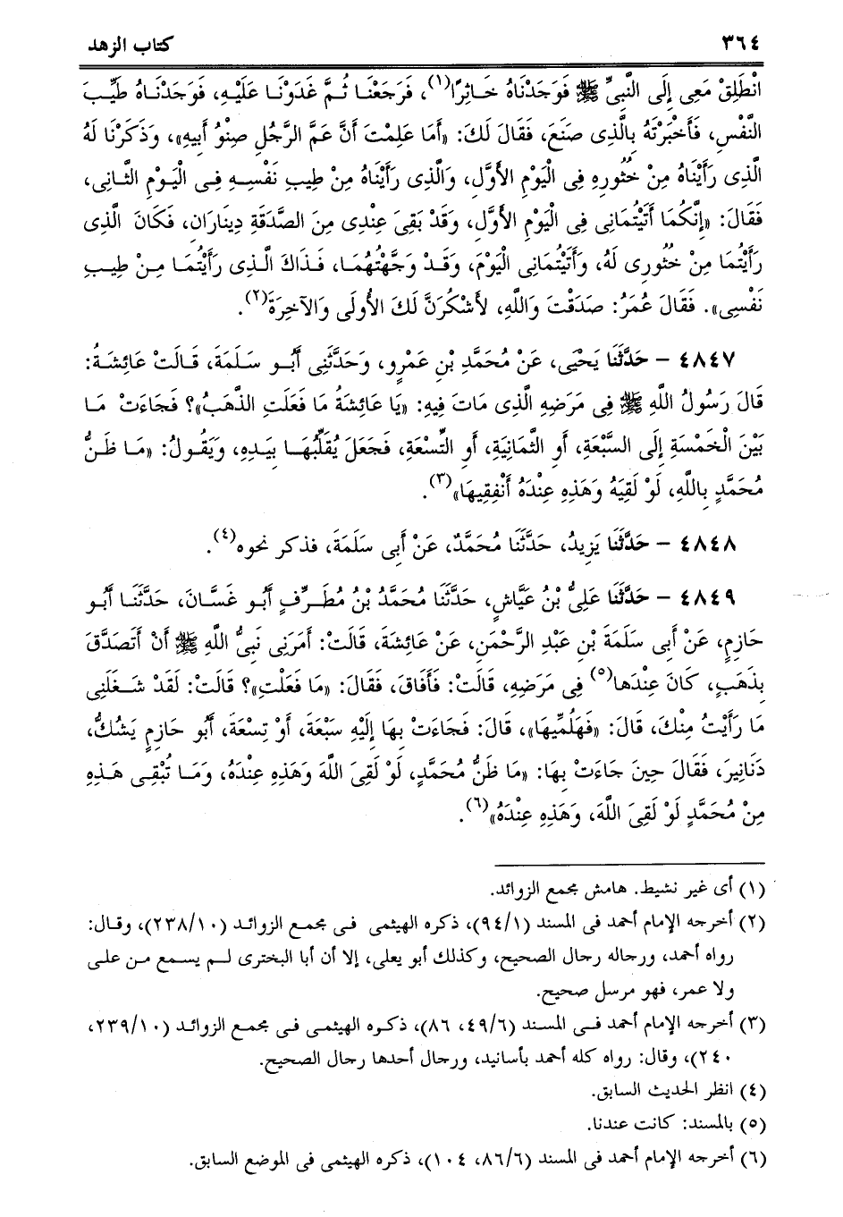 4849 - حَدَّثَنَا عَلِىُّ بْنُ عَيَّاشٍ، حَدَّثَنَا مُحَمَّدُ بْنُ مُطَرِّفٍ أَبُو غَسَّانَ، حَدَّثَنَا أَبُو حَازِمٍ، عَنْ أَبِى سَلَمَةَ بْنِ عَبْدِ الرَّحْمَنِ، عَنْ عَائِشَةَ، قَالَتْ: أَمَرَنِى نَبِىُّ اللَّهِ صلى الله عليه وسلم أَنْ أَتَصَدَّقَ بِذَهَبٍ، كَانَ عِنْدَها فِى مَرَضِهِ، قَالَتْ: فَأَفَاقَ، فَقَالَ: مَا فَعَلْتِ؟ قَالَتْ: لَقَدْ شَغَلَنِى مَا رَأَيْتُ مِنْكَ، قَالَ: فَهَلُمِّيهَا، قَالَ: فَجَاءَتْ بِهَا إِلَيْهِ سَبْعَةَ، أَوْ تِسْعَةَ، أَبُو حَازِمٍ يَشُكُّ، دَنَانِيرَ، فَقَالَ حِينَ جَاءَتْ بِهَا: مَا ظَنُّ مُحَمَّدٍ، لَوْ لَقِىَ اللَّهَ وَهَذِهِ عِنْدَهُ، وَمَا تُبْقِى هَذِهِ مِنْ مُحَمَّدٍ لَوْ لَقِىَ اللَّهَ، وَهَذِهِ عِنْدَهُ.