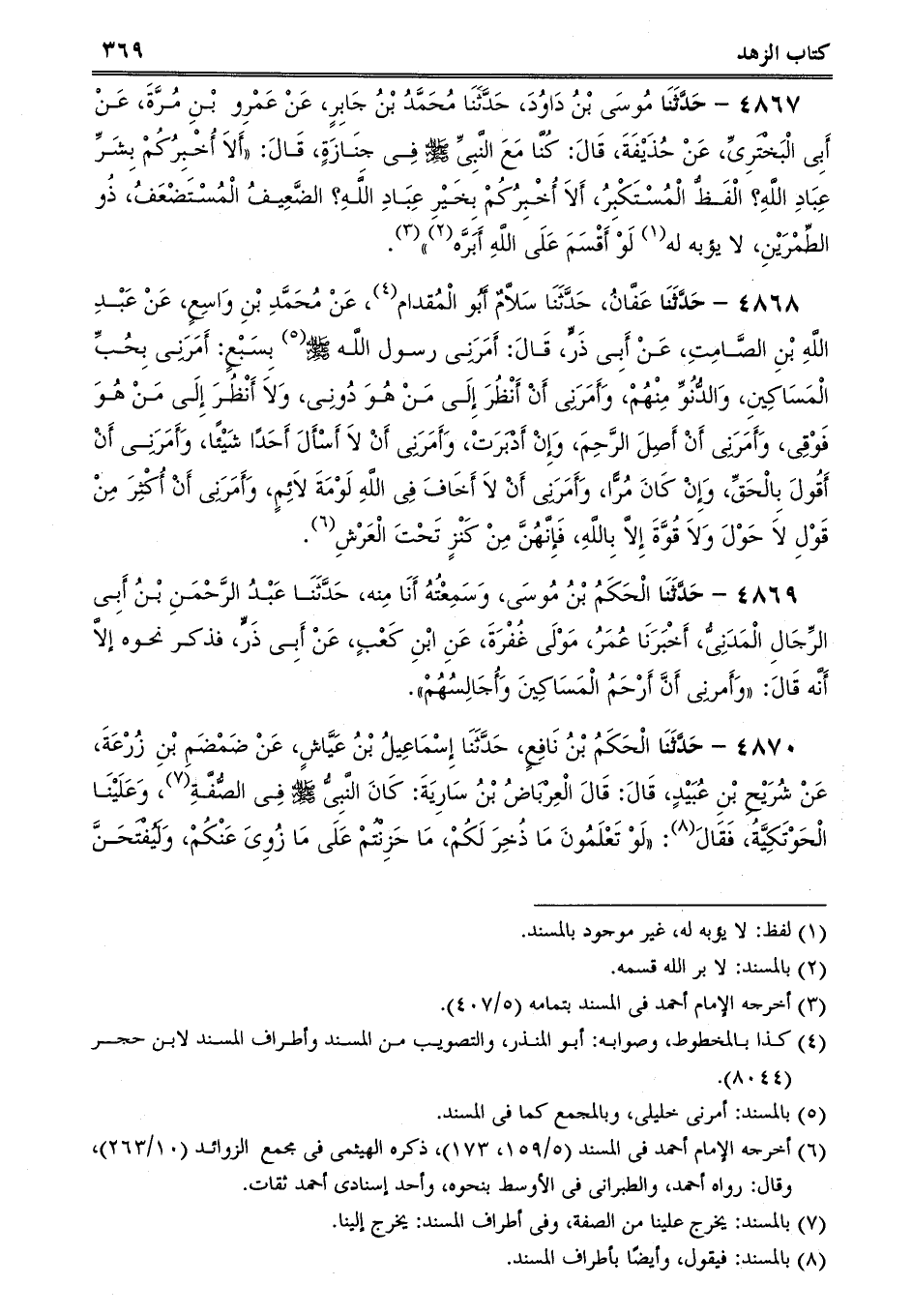 4868 - حَدَّثَنَا عَفَّانُ، حَدَّثَنَا سَلاَّمٌ أَبُو الْمُقدام، عَنْ مُحَمَّدِ بْنِ وَاسِعٍ، عَنْ عَبْدِ اللَّهِ بْنِ الصَّامِتِ، عَنْ أَبِى ذَرٍّ، قَالَ: أَمَرَنِى رسول اللَّه صلى الله عليه وسلم بِسَبْعٍ: أَمَرَنِى بِحُبِّ الْمَسَاكِينِ، وَالدُّنُوِّ مِنْهُمْ، وَأَمَرَنِى أَنْ أَنْظُرَ إِلَى مَنْ هُوَ دُونِى، وَلاَ أَنْظُرَ إِلَى مَنْ هُوَ فَوْقِى، وَأَمَرَنِى أَنْ أَصِلَ الرَّحِمَ، وَإِنْ أَدْبَرَتْ، وَأَمَرَنِى أَنْ لاَ أَسْأَلَ أَحَدًا شَيْئًا، وَأَمَرَنِى أَنْ أَقُولَ بِالْحَقِّ، وَإِنْ كَانَ مُرًّا، وَأَمَرَنِى أَنْ لاَ أَخَافَ فِى اللَّهِ لَوْمَةَ لاَئِمٍ، وَأَمَرَنِى أَنْ أُكْثِرَ مِنْ قَوْلِ لاَ حَوْلَ وَلاَ قُوَّةَ إِلاَّ بِاللَّهِ، فَإِنَّهُنَّ مِنْ كَنْزٍ تَحْتَ الْعَرْشِ.