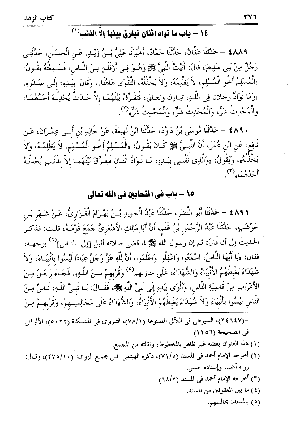 4889 - حَدَّثَنَا عَفَّانُ، حَدَّثَنَا حَمَّادٌ، أَخْبَرَنَا عَلِىُّ بْنُ زَيْدٍ، عَنِ الْحَسَنِ، حَدَّثَنِى رَجُلٌ مِنْ بَنِى سَلِيطٍ، قَالَ: أَتَيْتُ النَّبِىَّ صلى الله عليه وسلم وَهُوَ فِى أَزْفَلَةٍ مِنَ النَّاسِ، فَسَمِعْتُهُ يَقُولُ: الْمُسْلِمُ أَخُو الْمُسْلِمِ، لاَ يَظْلِمُهُ، وَلاَ يَخْذُلُهُ، التَّقْوَى هَاهُنَا، وَقَالَ بِيَدِهِ: إِلَى صَدْرِهِ، وَمَا تَوَادَّ رجلان فِى اللَّهِ، تبارك وتعالى، فُتفَرِّقُ بَيْنَهُمَا إِلاَّ حَدَثٌ يُحْدِثُهُ أَحَدُهُمَا، وَالْمُحْدِثُ شَرٌّ، وَالْمُحْدِثُ شَرٌّ، وَالْمُحْدِثُ شَرٌّ.