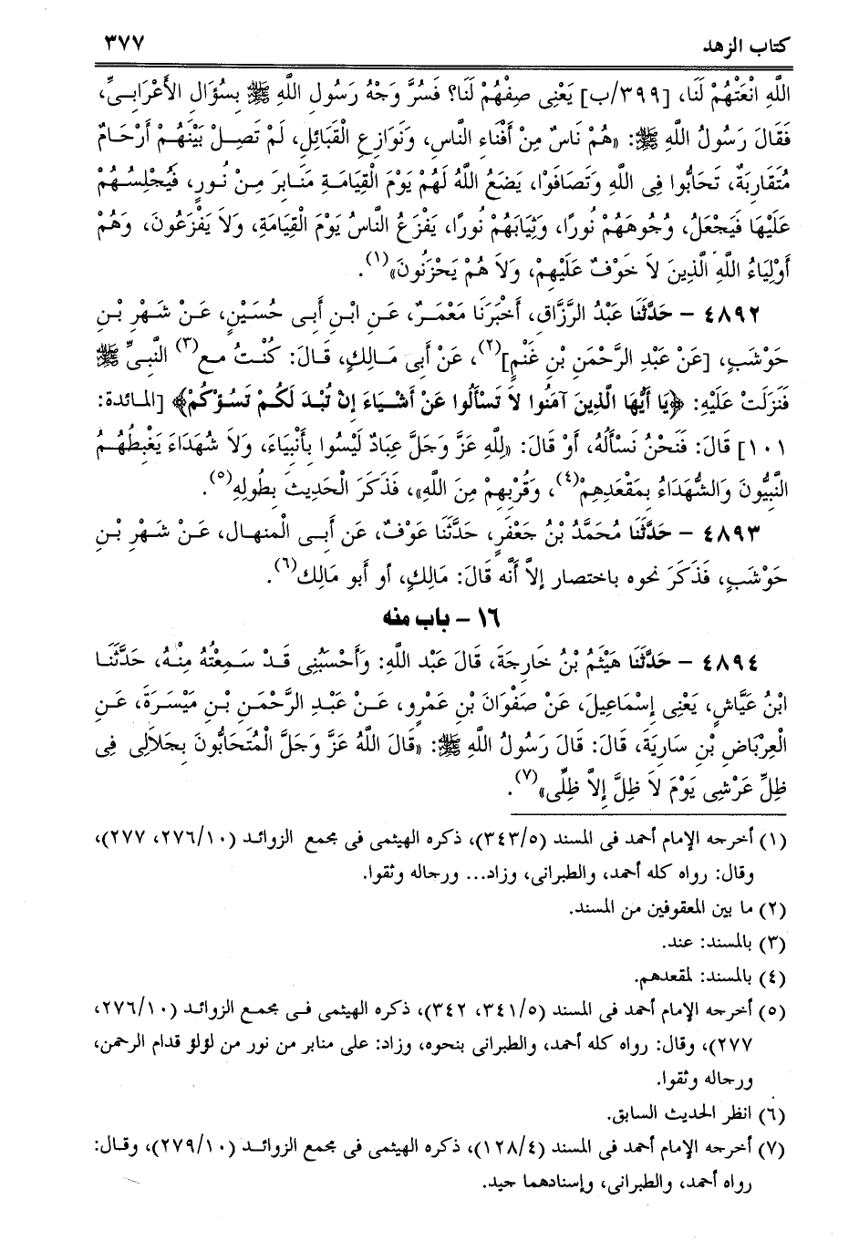 4892 - حَدَّثَنَا عَبْدُ الرَّزَّاقِ، أَخْبَرَنَا مَعْمَرٌ، عَنِ ابْنِ أَبِى حُسَيْنٍ، عَنْ شَهْرِ بْنِ حَوْشَبٍ، [عَنْ عَبْدِ الرَّحْمَنِ بْنِ غَنْمٍ] ، عَنْ أَبِى مَالِكٍ، قَالَ: كُنْتُ مع النَّبِىِّ صلى الله عليه وسلم فَنَزَلَتْ عَلَيْهِ: {يَا أَيُّهَا الَّذِينَ آمَنُوا لاَ تَسْأَلُوا عَنْ أَشْيَاءَ إِنْ تُبْدَ لَكُمْ تَسُؤْكُمْ} [المائدة] قَالَ: فَنَحْنُ نَسْأَلُهُ، أَوْ قَالَ: لِلَّهِ عَزَّ وَجَلَّ عِبَادٌ لَيْسُوا بِأَنْبِيَاءَ، وَلاَ شُهَدَاءَ يَغْبِطُهُمُ النَّبِيُّونَ وَالشُّهَدَاءُ بِمَقْعَدِهِمْ، وَقُرْبِهِمْ مِنَ اللَّهِ، فَذَكَرَ الْحَدِيثَ بِطُولِهِ.