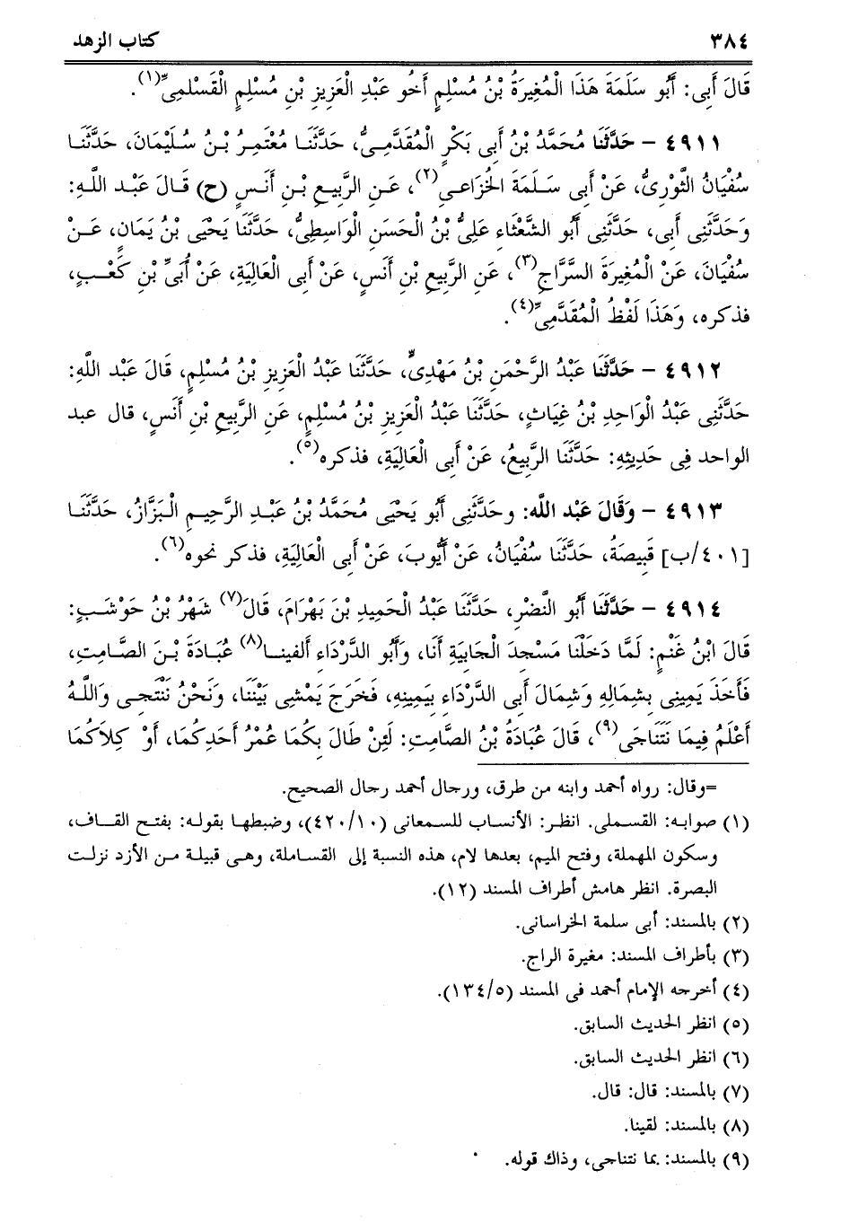 4911 - حَدَّثَنَا مُحَمَّدُ بْنُ أَبِى بَكْرٍ الْمُقَدَّمِىُّ، حَدَّثَنَا مُعْتَمِرُ بْنُ سُلَيْمَانَ، حَدَّثَنَا سُفْيَانُ الثَّوْرِىُّ، عَنْ أَبِى سَلَمَةَ الخُزَاعىِ، عَنِ الرَّبِيعِ بْنِ أَنَسٍ (ح) قَالَ عَبْد اللَّهِ: وَحَدَّثَنِى أَبِى، حَدَّثَنِى أَبُو الشَّعْثَاءِ عَلِىُّ بْنُ الْحَسَنِ الْوَاسِطِىُّ، حَدَّثَنَا يَحْيَى بْنُ يَمَانٍ، عَنْ سُفْيَانَ، عَنْ الْمُغِيرَةَ السَّرَّاجِ، عَنِ الرَّبِيعِ بْنِ أَنَسٍ، عَنْ أَبِى الْعَالِيَةِ، عَنْ أُبَىِّ بْنِ كَعْبٍ، فذكره، وَهَذَا لَفْظُ الْمُقَدَّمِىِّ.