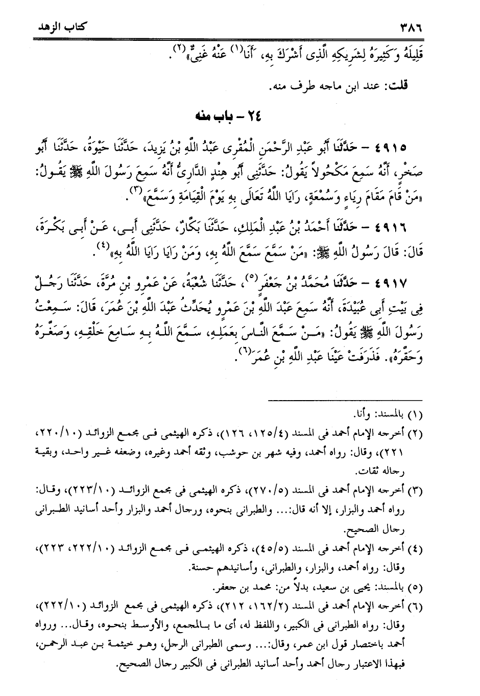 4915 - حَدَّثَنَا أَبُو عَبْدِ الرَّحْمَنِ الْمُقْرِى عَبْدُ اللَّهِ بْنُ يَزِيدَ، حَدَّثَنَا حَيْوَةُ، حَدَّثَنَا أَبُو صَخْرٍ، أَنَّهُ سَمِعَ مَكْحُولاً يَقُولُ: حَدَّثَنِى أَبُو هِنْدٍ الدَّارِىُّ أَنَّهُ سَمِعَ رَسُولَ اللَّهِ صلى الله عليه وسلم يَقُولُ: مَنْ قَامَ مَقَامَ رِيَاءٍ وَسُمْعَةٍ، رَايَا اللَّهُ تَعَالَى بِهِ يَوْمَ الْقِيَامَةِ وَسَمَّعَ.