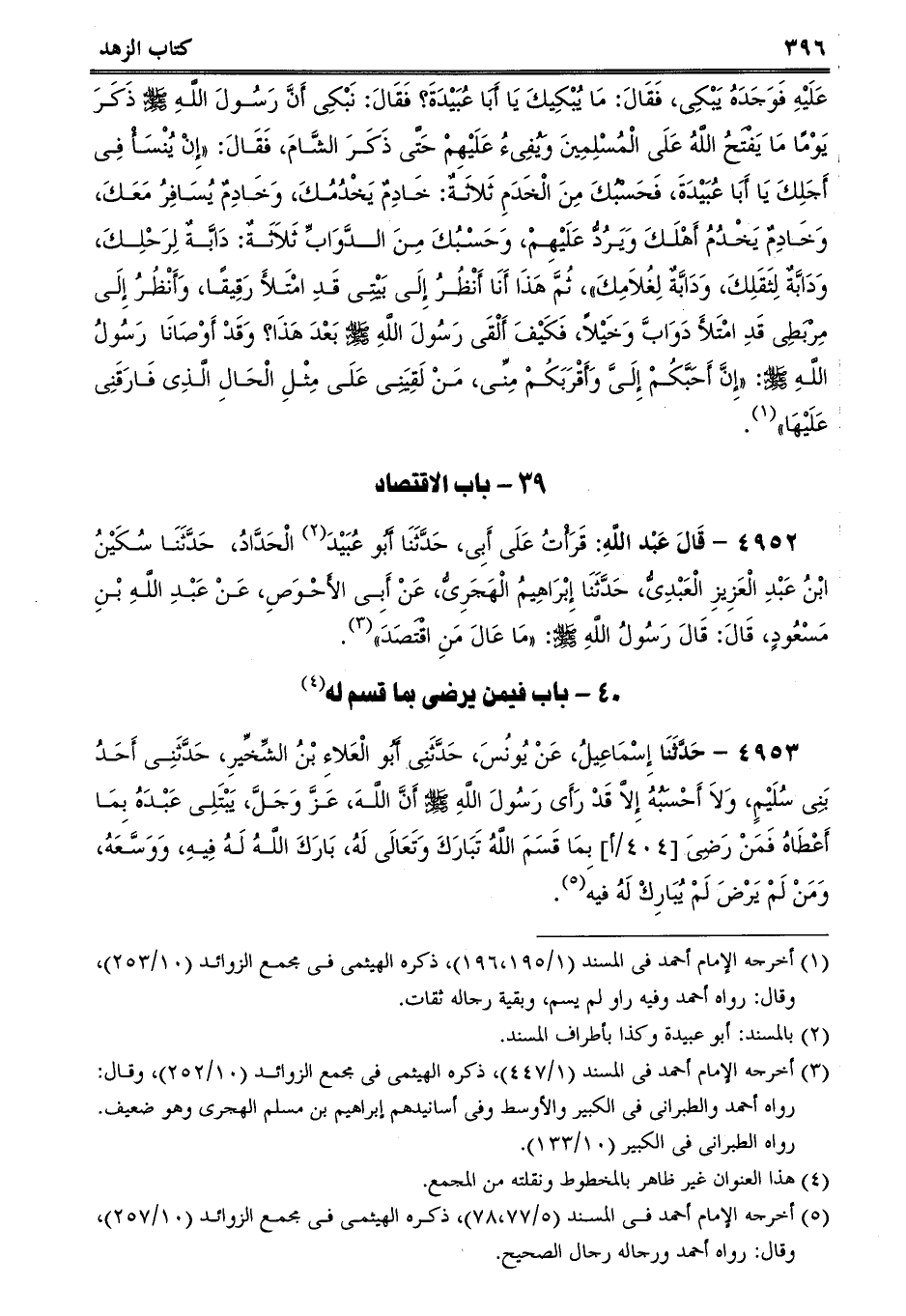 4952 - قَالَ عَبْد اللَّهِ: قَرَأْتُ عَلَى أَبِى، حَدَّثَنَا أَبُو عُبَيْدَ الْحَدَّادُ، حَدَّثَنَا سُكَيْنُ ابْنُ عَبْدِ الْعَزِيزِ الْعَبْدِىُّ، حَدَّثَنَا إِبْرَاهِيمُ الْهَجَرِىُّ، عَنْ أَبِى الأَحْوَصِ، عَنْ عَبْدِ اللَّهِ بْنِ مَسْعُودٍ، قَالَ: قَالَ رَسُولُ اللَّهِ صلى الله عليه وسلم: مَا عَالَ مَنِ اقْتَصَدَ.