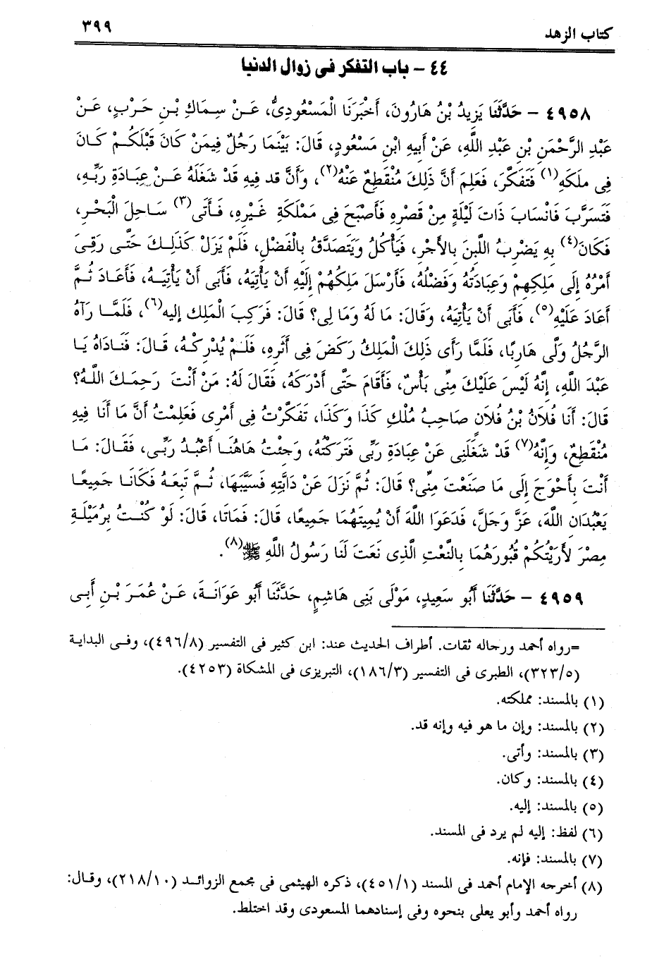 4958 - حَدَّثَنَا يَزِيدُ بْنُ هَارُونَ، أَخْبَرَنَا الْمَسْعُودِىُّ، عَنْ سِمَاكِ بْنِ حَرْبٍ، عَنْ عَبْدِ الرَّحْمَنِ بْنِ عَبْدِ اللَّهِ، عَنْ أَبِيهِ ابْنِ مَسْعُودٍ، قَالَ: بَيْنَمَا رَجُلٌ فِيمَنْ كَانَ قَبْلَكُمْ كَانَ فِى ملَكَهِ فَتَفَكَّرَ، فَعَلِمَ أَنَّ ذَلِكَ مُنْقَطِعٌ عَنْهُ، وَأَنَّ قد فِيهِ قَدْ شَغَلَهُ عَنْ عِبَادَةِ رَبِّهِ، فَتَسَرَّبَ فَانْسَابَ ذَاتَ لَيْلَةٍ مِنْ قَصْرِهِ فَأَصْبَحَ فِى مَمْلَكَةِ غَيْرِهِ، فَأَتَى سَاحِلَ الْبَحْرِ، فَكَانَ بِهِ يَضْرِبُ اللَّبِنَ بِالأَجْرِ، فَيَأْكُلُ وَيَتَصَدَّقُ بِالْفَضْلِ، فَلَمْ يَزَلْ كَذَلِكَ حَتَّى رَقِىَ أَمْرُهُ إِلَى مَلِكِهِمْ وَعِبَادَتُهُ وَفَضْلُهُ، فَأَرْسَلَ مَلِكُهُمْ إِلَيْهِ أَنْ يَأْتِيَهُ، فَأَبَى أَنْ يَأْتِيَهُ، فَأَعَادَ ثُمَّ أَعَادَ عَلَيْهِ، فَأَبَى أَنْ يَأْتِيَهُ، وَقَالَ: مَا لَهُ وَمَا لِى؟ قَالَ: فَرَكِبَ الْمَلِك إليه، فَلَمَّا رَآهُ الرَّجُلُ وَلَّى هَارِبًا، فَلَمَّا رَأَى ذَلِكَ الْمَلِكُ رَكَضَ فِى أَثَرِهِ، فَلَمْ يُدْرِكْهُ، قَالَ: فَنَادَاهُ يَا عَبْدَ اللَّهِ، إِنَّهُ لَيْسَ عَلَيْكَ مِنِّى بَأْسٌ، فَأَقَامَ حَتَّى أَدْرَكَهُ، فَقَالَ لَهُ: مَنْ أَنْتَ رَحِمَكَ اللَّهُ؟ قَالَ: أَنَا فُلاَنُ بْنُ فُلاَنٍ صَاحِبُ مُلْكِ كَذَا وَكَذَا، تَفَكَّرْتُ فِى أَمْرِى فَعَلِمْتُ أَنَّ مَا أَنَا فِيهِ مُنْقَطِعٌ، وَإِنَّهُ قَدْ شَغَلَنِى عَنْ عِبَادَةِ رَبِّى فَتَرَكْتُهُ، وَجِئْتُ هَاهُنَا أَعْبُدُ رَبِّى، فَقَالَ: مَا أَنْتَ بِأَحْوَجَ إِلَى مَا صَنَعْتَ مِنِّى؟ قَالَ: ثُمَّ نَزَلَ عَنْ دَابَّتِهِ فَسَيَّبَهَا، ثُمَّ تَبِعَهُ فَكَانَا جَمِيعًا يَعْبُدَانِ اللَّهَ، عَزَّ وَجَلَّ، فَدَعَوَا اللَّهَ أَنْ يُمِيتَهُمَا جَمِيعًا، قَالَ: فَمَاتَا، قَالَ: لَوْ كُنْتُ بِرُمَيْلَةِ مِصْرَ لأَرَيْتُكُمْ قُبُورَهُمَا بِالنَّعْتِ الَّذِى نَعَتَ لَنَا رَسُولُ اللَّهِ صلى الله عليه وسلم.