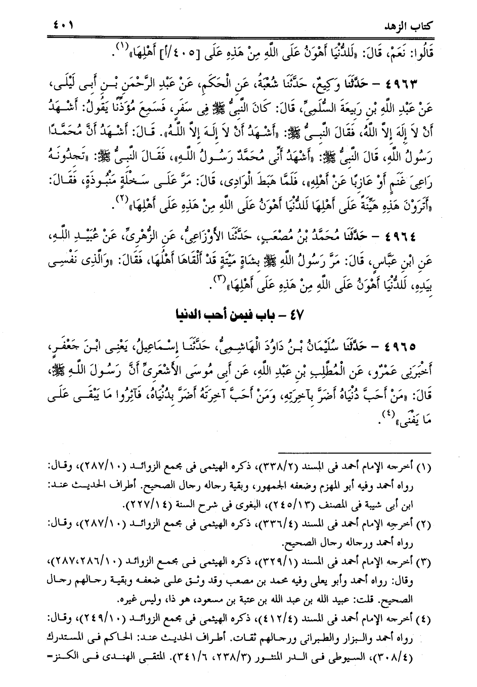 4963 - حَدَّثَنَا وَكِيعٌ، حَدَّثَنَا شُعْبَةُ، عَنِ الْحَكَمِ، عَنْ عَبْدِ الرَّحْمَنِ بْنِ أَبِى لَيْلَى، عَنْ عَبْدِ اللَّهِ بْنِ رَبِيعَةَ السُّلَمِىِّ، قَالَ: كَانَ النَّبِىُّ صلى الله عليه وسلم فِى سَفَرٍ، فَسَمِعَ مُؤَذِّنًا يَقُولُ: أَشْهَدُ أَنْ لاَ إِلَهَ إِلاَّ اللَّهُ، فَقَالَ النَّبِىُّ صلى الله عليه وسلم: أَشْهَدُ أَنْ لاَ إِلَهَ إِلاَّ اللَّهُ. قَالَ: أَشْهَدُ أَنَّ مُحَمَّدًا رَسُولُ اللَّهِ، قَالَ النَّبِىُّ صلى الله عليه وسلم: أَشْهَدُ أَنِّى مُحَمَّدٌ رَسُولُ اللَّهِ، فَقَالَ النَّبِىُّ صلى الله عليه وسلم: تَجِدُونَهُ رَاعِىَ غَنَمٍ أَوْ عَازِبًا عَنْ أَهْلِهِ، فَلَمَّا هَبَطَ الْوَادِى، قَالَ: مَرَّ عَلَى سَخْلَةٍ مَنْبُوذَةٍ، فَقَالَ: أَتَرَوْنَ هَذِهِ هَيِّنَةً عَلَى أَهْلِهَا لَلدُّنْيَا أَهْوَنُ عَلَى اللَّهِ مِنْ هَذِهِ عَلَى أَهْلِهَا.