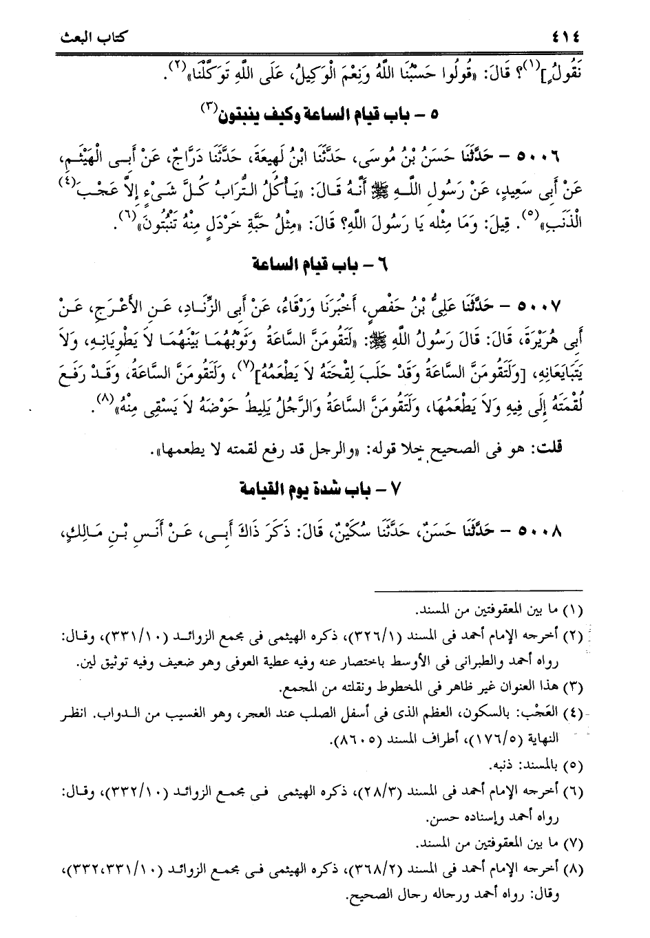 5006 - حَدَّثَنَا حَسَنُ بْنُ مُوسَى، حَدَّثَنَا ابْنُ لَهِيعَةَ، حَدَّثَنَا دَرَّاجٌ، عَنْ أَبِى الْهَيْثَمِ، عَنْ أَبِى سَعِيدٍ، عَنْ رَسُولِ اللَّهِ صلى الله عليه وسلم أَنَّهُ قَالَ: يَأْكُلُ التُّرَابُ كُلَّ شَىْءٍ إِلاَّ عَجْبَ الْذَنَبِ. قِيلَ: وَمَا مِثْله يَا رَسُولَ اللَّهِ؟ قَالَ: مِثْلُ حَبَّةِ خَرْدَلٍ مِنْهُ تَنْبُتُونَ.