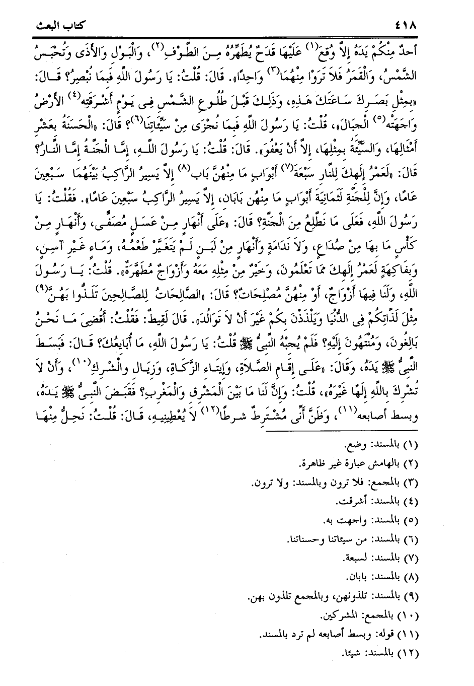 أحدٌ مِنْكُمْ يَدَهُ إِلاَّ وُقعَ عَلَيْهَا قَدَحٌ يُطَهِّرُهُ مِنَ الطَّوْفِ، وَالْبَوْلِ وَالأَذَى وَتُحْبَسُ الشَّمْسُ، وَالْقَمَرُ فَلاَ تَرَوْا مِنْهُمَا وَاحِدًا. قَالَ: قُلْتُ: يَا رَسُولَ اللَّهِ فَبِمَا نُبْصِرُ؟ قَالَ: بِمِثْلِ بَصَرِكَ سَاعَتَكَ هَذِهِ، وَذَلِكَ قَبْلَ طُلُوعِ الشَّمْسِ فِى يَوْمٍ أَشْرَقَتِه الأَرْضُ وَاجَهَتْه الْجِبَالَ، قُلْتُ: يَا رَسُولَ اللَّهِ فَبِمَا نُجْزَى مِنْ سَيِّئَاتِنَا؟ قَالَ: الْحَسَنَةُ بِعَشْرِ أَمْثَالِهَا، وَالسَّيِّئَةُ بِمِثْلِهَا، إِلاَّ أَنْ يَعْفُوَ. قَالَ: قُلْتُ: يَا رَسُولَ اللَّهِ، إِمَّا الْجَنَّةُ إِمَّا النَّارُ؟ قَالَ: لَعَمْرُ إِلَهِكَ لِلنَّارِ سَبْعَةَ أَبْوَابٍ مَا مِنْهُنَّ بَاب إِلاَّ يَسِيرُ الرَّاكِبُ بَيْنَهُمَا سَبْعِينَ عَامًا، وَإِنَّ لِلْجَنَّةِ لَثَمَانِيَةَ أَبْوَابٍ مَا مِنْهُن بَابَانِ، إِلاَّ يَسِيرُ الرَّاكِبُ سَبْعِينَ عَامًا. فَقُلْتُ: يَا رَسُولَ اللَّهِ، فَعَلَى مَا نَطَّلِعُ مِنَ الْجَنَّةِ؟ قَالَ: عَلَى أَنْهَارٍ مِنْ عَسَلٍ مُصَفًّى، وَأَنْهَارٍ مِنْ كَأْسٍ مَا بِهَا مِنْ صُدَاعٍ، وَلاَ نَدَامَةٍ وَأَنْهَارٍ مِنْ لَبَنٍ لَمْ يَتَغَيَّرْ طَعْمُهُ، وَمَاءٍ غَيْرِ آسِنٍ، وَبِفَاكِهَةٍ لَعَمْرُ إِلَهِكَ ممَا تَعْلَمُونَ، وَخَيْرٌ مِنْ مِثْلِهِ مَعَهُ وَأَزْوَاجٌ مُطَهَّرَةٌ. قُلْتُ: يَا رَسُولَ اللَّهِ، وَلَنَا فِيهَا أَزْوَاجٌ، أَوْ مِنْهُنَّ مُصْلِحَاتٌ؟ قَالَ: الصَّالِحَاتُ لِلصَّالِحِينَ تَلَذُّوا بَهُنَّ مِثْلَ لَذَّاتِكُمْ فِى الدُّنْيَا وَيَلْذَذْنَ بِكُمْ غَيْرَ أَنْ لاَ تَوَالُدَ. قَالَ لَقِيطٌ: فَقُلْتُ: أَقُضِىَ مَا نَحْنُ بَالِغُونَ، وَمُنْتَهُونَ إِلَيْهِ؟ فَلَمْ يُجِبْهُ النَّبِىُّ صلى الله عليه وسلم قُلْتُ: يَا رَسُولَ اللَّهِ، مَا أُبَايِعُكَ؟ قَالَ: فَبَسَطَ النَّبِىُّ صلى الله عليه وسلم يَدَهُ، وَقَالَ: عَلَى إِقَامِ الصَّلاَةِ، وَإِيتَاءِ الزَّكَاةِ، وَزِيَالِ والْشْرِكِ، وَأَنْ لاَ تُشْرِكَ بِاللَّهِ إِلَهًا غَيْرَهُ، قُلْتُ: وَإِنَّ لَنَا مَا بَيْنَ الْمَشْرِقِ وَالْمَغْرِبِ؟ فَقَبَضَ النَّبِىُّ صلى الله عليه وسلم يَدَهُ، وبسط أصابعه، وَظَنَّ أَنِّى مُشْتَرِطٌ شرطًا لاَ يُعْطِينِيهِ، قَالَ: قُلْتُ: نَحِلُّ مِنْهَا