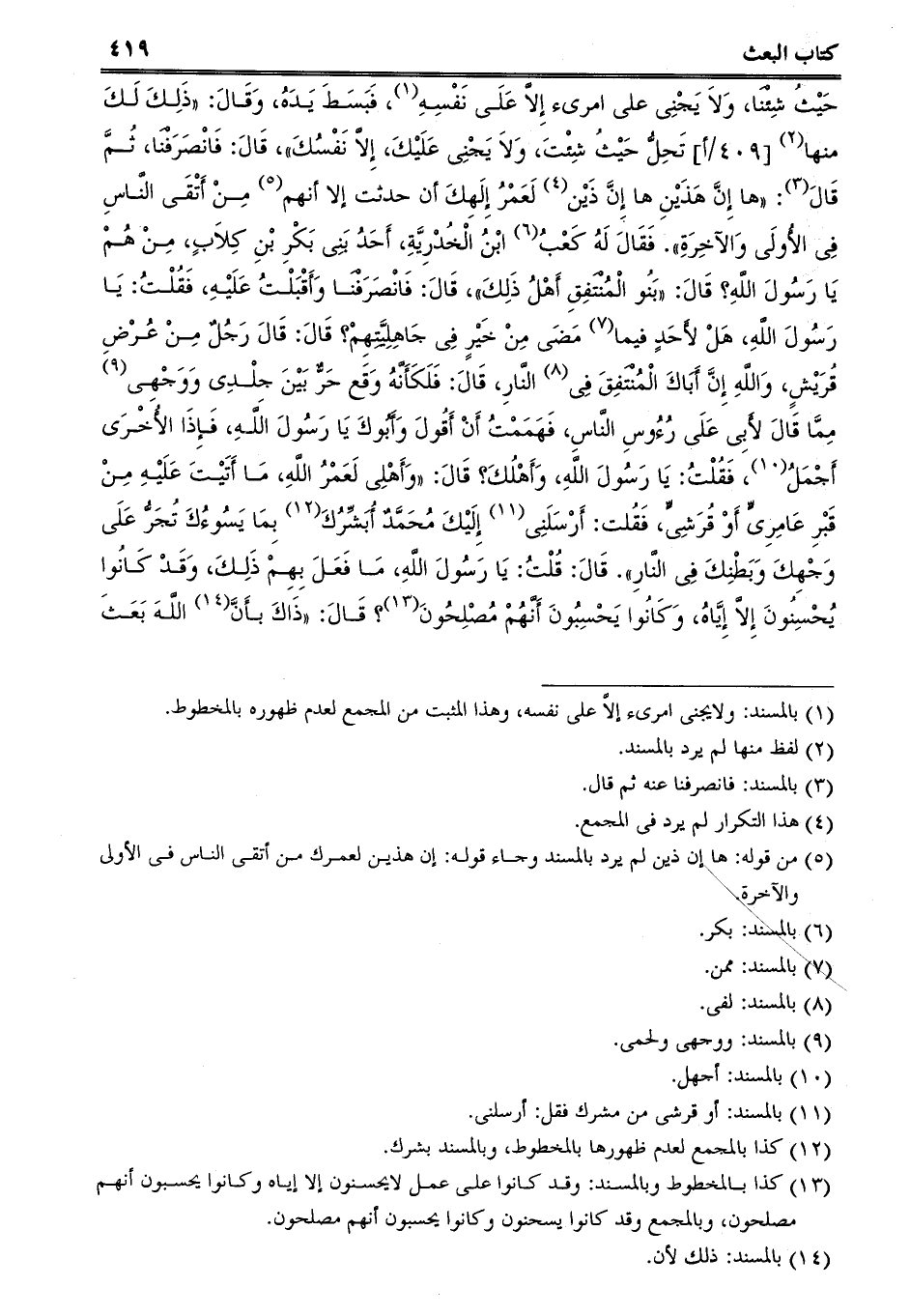 فَلَكَأَنَّهُ وَقَعَ حَرٌّ بَيْنَ جِلْدِى وَوَجْهِى مِمَّا قَالَ لأَبِى عَلَى رُءُوسِ النَّاسِ، فَهَمَمْتُ أَنْ أَقُولَ وَأَبُوكَ يَا رَسُولَ اللَّهِ، فَإِذَا الأُخْرَى أَجْمَلُ، فَقُلْتُ: يَا رَسُولَ اللَّهِ، وَأَهْلُكَ؟ قَالَ: وَأَهْلِى لَعَمْرُ اللَّهِ، مَا أَتَيْتَ عَلَيْهِ مِنْ قَبْرِ عَامِرِىٍّ أَوْ قُرَشِىٍّ، فَقُلت: أَرْسَلَنِى إِلَيْكَ مُحَمَّدٌ أُبَشِّرُكَ بِمَا يَسُوءُكَ تُجَرُّ عَلَى وَجْهِكَ وَبَطْنِكَ فِى النَّارِ. قَالَ: قُلْتُ: يَا رَسُولَ اللَّهِ، مَا فَعَلَ بِهِمْ ذَلِكَ، وَقَدْ كَانُوا يُحْسِنُونَ إِلاَّ إِيَّاهُ، وَكَانُوا يَحْسِبُونَ أَنَّهُمْ مُصْلِحُونَ؟ قَالَ: ذَاكَ بأَنَّ اللَّهَ بَعَثَ -[420]- فِى آخِرِ كُلِّ سَبْعِ أُمَمٍ، يَعْنِى نَبِيًّا، فَمَنْ عَصَى نَبِيَّهُ، كَانَ مِنَ الضَّالِّينَ، وَمَنْ أَطَاعَ نَبِيَّهُ كَانَ مِنَ الْمُهْتَدِينَ.