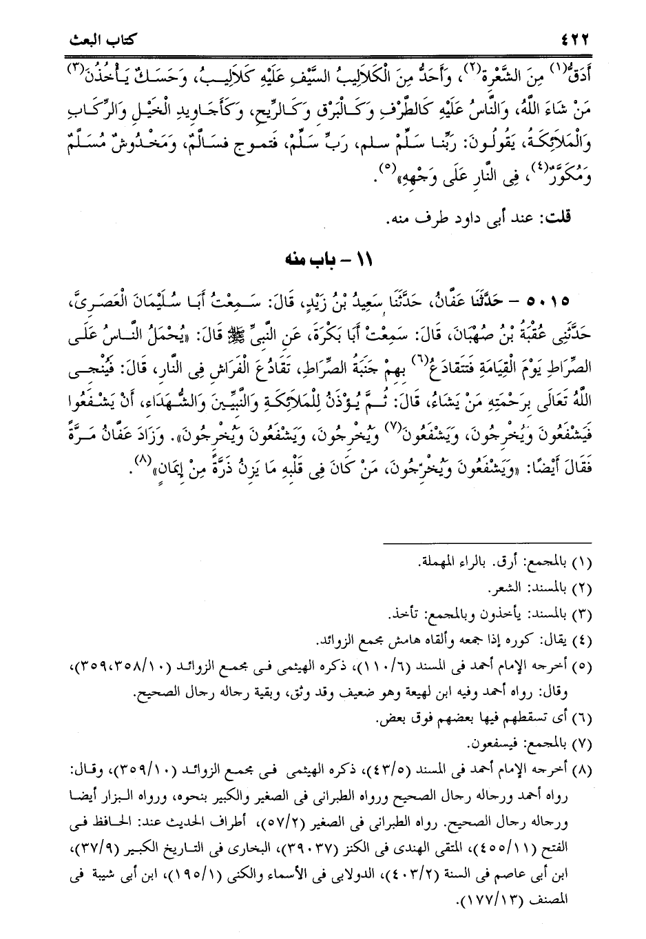5015 - حَدَّثَنَا عَفَّانُ، حَدَّثَنَا سَعِيدُ بْنُ زَيْدٍ، قَالَ: سَمِعْتُ أَبَا سُلَيْمَانَ الْعَصَرِىَّ، حَدَّثَنِى عُقْبَةُ بْنُ صُهْبَانَ، قَالَ: سَمِعْتْ أَبَا بَكْرَةَ، عَنِ النَّبِىِّ صلى الله عليه وسلم قَالَ: يُحْمَلُ النَّاسُ عَلَى الصِّرَاطِ يَوْمَ الْقِيَامَةِ فَتتَقادَعُ بِهِمْ جَنَبَةُ الصِّرَاطِ، تَقَادُعَ الْفَرَاشِ فِى النَّارِ، قَالَ: فَيُنْجِى اللَّهُ تَعَالَى بِرَحْمَتِهِ مَنْ يَشَاءُ، قَالَ: ثُمَّ يُؤْذَنُ لِلْمَلاَئِكَةِ وَالنَّبِيِّينَ وَالشُّهَدَاءِ، أَنْ يَشْفَعُوا فَيَشْفَعُونَ وَيُخْرِجُونَ، وَيَشْفَعُونَ وَيُخْرِجُونَ، وَيَشْفَعُونَ وَيُخْرِجُونَ. وَزَادَ عَفَّانُ مَرَّةً فَقَالَ أَيْضًا: وَيَشْفَعُونَ وَيُخْرِجُونَ، مَنْ كَانَ فِى قَلْبِهِ مَا يَزِنُ ذَرَّةً مِنْ إِيمَانٍ.