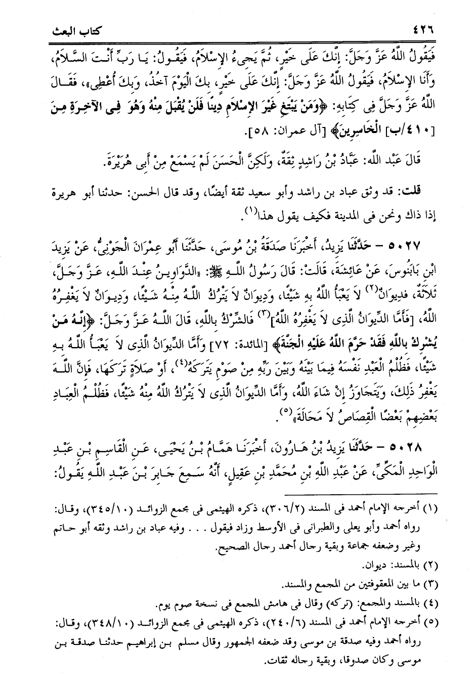 5028 - حَدَّثَنَا يَزِيدُ بْنُ هَارُونَ، أَخْبَرَنَا هَمَّامُ بْنُ يَحْيَى، عَنِ الْقَاسِمِ بْنِ عَبْدِ الْوَاحِدِ الْمَكِّىِّ، عَنْ عَبْدِ اللَّهِ بْنِ مُحَمَّدِ بْنِ عَقِيلٍ، أَنَّهُ سَمِعَ جَابِرَ بْنَ عَبْدِ اللَّهِ يَقُولُ: -[427]- بَلَغَنِى عَنْ رَجُلٍ حَدِيثٌ سَمِعَهُ مِنْ رَسُولِ اللَّهِ صلى الله عليه وسلم، فَاشْتَرَيْتُ بَعِيرًا، ثُمَّ شَدَدْتُ عَلَيْهِ رَحْلِى، ثم سِرْتُ إِلَيْهِ شَهْرًا، حَتَّى قَدِمْتُ عَلَيْهِ الشَّامَ، فَإِذَا عَبْدُ اللَّهِ بْنُ أُنَيْسٍ، فَقُلْتُ: لِلْبَوَّابِ، قُلْ لَهُ: جَابِرٌ عَلَى الْبَابِ، فَقَالَ: ابْنُ عَبْدِ اللَّهِ؟ قُلْتُ: نَعَمْ، فَخَرَجَ يَطَأُ ثَوْبَهُ فَاعْتَنَقَنِى وَاعْتَنَقْتُهُ، فَقُلْتُ: حَدِيثًا بَلَغَنِى عَنْكَ أَنَّكَ سَمِعْتَهُ مِنْ رَسُولِ اللَّهِ صلى الله عليه وسلم فِى الْقِصَاصِ، فَخَشِيتُ أَنْ تَمُوتَ أَوْ أَمُوتَ قَبْلَ أَنْ أَسْمَعَهُ، قَالَ: سَمِعْتُ رَسُولَ اللَّهِ صلى الله عليه وسلم يَقُولُ: يُحْشَرُ الْعِبَادُ يَوْمَ الْقِيَامَةِ، أَوْ قَالَ، عُرَاةً غُرْلاً بُهْمًا، قَالَ: قُلْنَا وَمَا بُهْمًا؟ قَالَ: لَيْسَ مَعَهُمْ شَىْءٌ، ثُمَّ يُنَادِيهِمْ بِصَوْتٍ يَسْمَعُهُ من بعد، كما يَسْمَعَهُ مِنْ قُرْب، أَنَا الدَّيَّانُ، أَنَا الْمَلِكُ، وَلاَ يَنْبَغِى لأَحَدٍ مِنْ أَهْلِ النَّارِ، أَنْ يَدْخُلَ النَّارَ، وَلَهُ عِنْدَ أَحَدٍ مِنْ أَهْلِ الْجَنَّةِ حَقٌّ حَتَّى أَقُضيهُ، وَلاَ يَنْبَغِى لأَحَدٍ مِنْ أَهْلِ الْجَنَّةِ، أَنْ يَدْخُلَ الْجَنَّةَ، وَلأَحَدٍ عِنْدَهُ حَقٌّ حَتَّى أَقُضيهُ مِعْهُ حَتَّى اللَّطْمَةُ. قَالَ: قُلْنَا: كَيْفَ وَإِنَّا إِنَّمَا نَأْتِى اللَّهَ عُرَاةً غُرْلاً بُهْمًا؟ قَالَ: الْحَسَنَاتِ وَالسَّيِّئَاتِ.