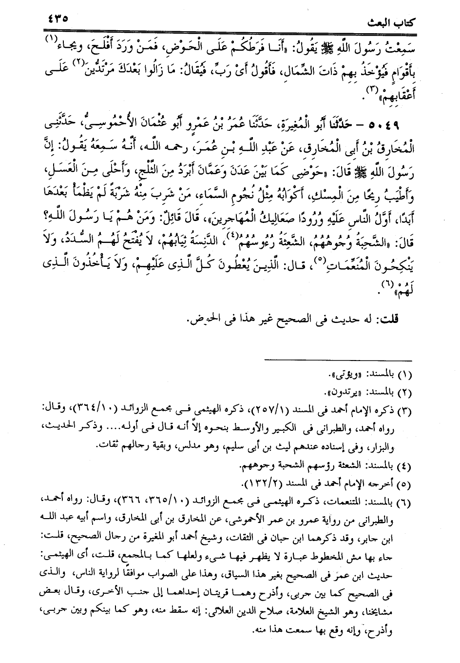 5049 - حَدَّثَنَا أَبُو الْمُغِيرَةِ، حَدَّثَنَا عُمَرُ بْنُ عَمْرٍو أَبُو عُثْمَانَ الأُحْمُوسِىُّ، حَدَّثَنِى الْمُخَارِقُ بْنُ أَبِى الْمُخَارِقِ، عَنْ عَبْدِ اللَّهِ بْنِ عُمَرَ، رحمه اللَّه، أَنَّهُ سَمِعَهُ يَقُولُ: إِنَّ رَسُولَ اللَّهِ صلى الله عليه وسلم قَالَ: حَوْضِى كَمَا بَيْنَ عَدَنَ وَعَمَّانَ أَبْرَدُ مِنَ الثَّلْجِ، وَأَحْلَى مِنَ الْعَسَلِ، وَأَطْيَبُ رِيحًا مِنَ الْمِسْكِ، أَكْوَابُهُ مِثْلُ نُجُومِ السَّمَاءِ، مَنْ شَرِبَ مِنْهُ شَرْبَةً لَمْ يَظْمَأْ بَعْدَهَا أَبَدًا، أَوَّلُ النَّاسِ عَلَيْهِ وُرُودًا صَعَالِيكُ الْمُهَاجِرِينَ، قَالَ قَائِلٌ: وَمَنْ هُمْ يَا رَسُولَ اللَّهِ؟ قَالَ: الشَّحِبَةُ وُجُوهُهُمُ، الشَّعِثَةُ رُءُوسُهُمُ، الدَّنِسَةُ ثِيَابُهُمْ، لاَ يُفْتَحُ لَهُمُ السُّدَدُ، وَلاَ يَنْكِحُونَ الْمُنَعِّمَاتِ، قال: الَّذِينَ يُعْطُونَ كُلَّ الَّذِى عَلَيْهِمْ، وَلاَ يَأْخُذُونَ الَّذِى لَهُمْ.