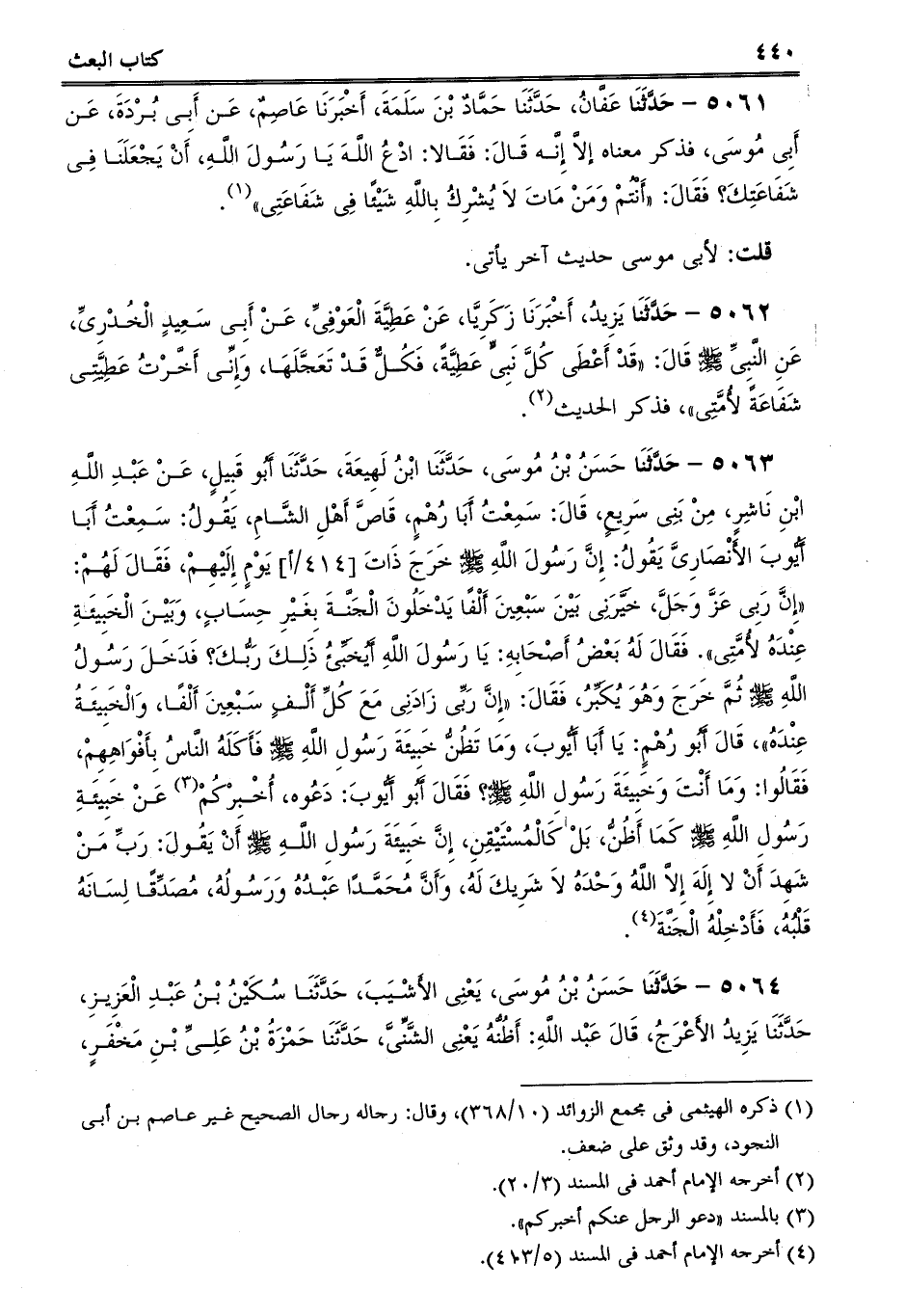 5064 - حَدَّثَنَا حَسَنُ بْنُ مُوسَى، يَعْنِى الأَشْيَبَ، حَدَّثَنَا سُكَيْنُ بْنُ عَبْدِ الْعَزِيزِ، حَدَّثَنَا يَزِيدُ الأَعْرَجُ، قَالَ عَبْد اللَّهِ: أَظُنُّهُ يَعْنِى الشَّنِّىَّ، حَدَّثَنَا حَمْزَةُ بْنُ عَلِىِّ بْنِ مَخْفَرٍ، -[441]- عَن أَبِى بُرْدَةَ، عَن أَبِى مُوسَى، قَالَ: غَزَوْنَا مَعَ رَسُولِ اللَّهِ صلى الله عليه وسلم فِى بَعْضِ أَسْفَارِهِ، قَالَ: فَعَرَّسَ بِنَا رَسُولُ اللَّهِ صلى الله عليه وسلم، فَانْتَهَيْتُ بَعْضَ اللَّيْلِ إِلَى مُنَاخِ رَسُولِ اللَّهِ صلى الله عليه وسلم أَطْلُبُهُ، فَلَمْ أَجِدْهُ، فَخَرَجْتُ بَارِزًا أَطْلُبُهُ، وَإِذَا رَجُلٌ مِنْ أَصْحَابِ رَسُولِ اللَّهِ صلى الله عليه وسلم يَطْلُبُ مَا أَطْلُبُ، قَالَ: فَبَيْنَا نَحْنُ كَذَلِكَ، إِذِ اتَّجَهَ إِلَيْنَا رَسُولُ اللَّهِ صلى الله عليه وسلم، قَالَ: فَقُلْنَا: يَا رَسُولَ اللَّهِ، أَنْتَ بِأَرْضِ حَرْبٍ، وَلاَ نَأْمَنُ عَلَيْكَ، فَلَوْلاَ إِذْ بَدَتْ لَكَ الْحَاجَةُ قُلْتَ لِبَعْضِ أَصْحَابِكَ فَقَامَ مَعَكَ، قَالَ: فَقَالَ رَسُولُ اللَّهِ صلى الله عليه وسلم: إِنِّى سَمِعْتُ هَزِيزًا كَهَزِيزِ الرَّحَى، وْحَنِينًا كَحَنِينِ النَّحْلِ، وَأَتَانِى آتٍ مِنْ رَبِّى فَخَيَّرَنِى بأَنْ يَدْخُلَ ثُلث أُمَّتِى الْجَنَّةَ وَبَيْنَ شَفَاعَتِى لَهُمْ، فَاخْتَرْتُ شَفَاعَتِى لَهُمْ وَعَلِمْتُ أَنَّهَا أَوْسَعُ لَهُمْ فَخَيَّرَنِى بِأَنْ يَدْخُلَ شطر أُمَّتِى الْجَنَّةَ، وَبَيْنَ الشَّفَاعَةِ لَهُمْ، فَاخْتَرْتُ شَفَاعَتِى لَهُمْ، وَعَلِمْتُ أَنَّهَا أَوْسَعُ لَهُمْ، فَقَالاَ: يَا رَسُولَ اللَّهِ، ادْعُ اللَّهَ أَنْ يَجْعَلَنَا مِنْ أَهْلِ شَفَاعَتِكَ، فَدَعَا لَهُمَا، ثُمَّ أنَّهُمَا انَتهيا أَصْحَابَ رَسُولِ اللَّهِ صلى الله عليه وسلم وَأَخْبَرَاهُمْ بِقَوْلِ رَسُولِ اللَّهِ صلى الله عليه وسلم قَالَ: فَجَعَلُوا يَأْتُونَهُ، وَيَقُولُونَ يَا رَسُولَ اللَّهِ ادْعُ اللَّهَ أَنْ يَجْعَلَنَا مِنْ أَهْلِ شَفَاعَتِكَ؟ فَيَدْعُوَ لَهُمْ، قَالَ: فَلَمَّا أَضَبَّ عَلَيْهِ الْقَوْمُ وَكَثُرُوا، قَالَ رَسُولُ اللَّهِ صلى الله عليه وسلم: إِنَّهَا لِمَنْ مَاتَ، وَهُوَ يَشْهَدُ أَنْ لاَ إِلَهَ إِلاَّ اللَّهُ.