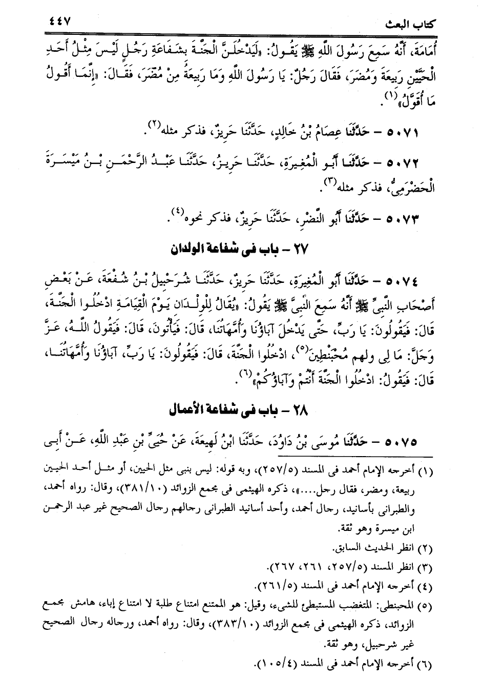 5074 - حَدَّثَنَا أَبُو الْمُغِيرَةِ، حَدَّثَنَا حَرِيزٌ، حَدَّثَنَا شُرَحْبِيلُ بْنُ شُفْعَةَ، عَنْ بَعْضِ أَصْحَابِ النَّبِىِّ صلى الله عليه وسلم أَنَّهُ سَمِعَ النَّبِىَّ صلى الله عليه وسلم يَقُولُ: يُقَالُ لِلْوِلْدَانِ يَوْمَ الْقِيَامَةِ ادْخُلُوا الْجَنَّةَ، قَالَ: فَيَقُولُونَ: يَا رَبِّ، حَتَّى يَدْخُلَ آبَاؤُنَا وَأُمَّهَاتُنَا، قَالَ: فَيَأْتُونَ، قَالَ: فَيَقُولُ اللَّهُ، عَزَّ وَجَلَّ: مَا لِى ولهم مُحْبَنْطِينَ، ادْخُلُوا الْجَنَّةَ، قَالَ: فَيَقُولُونَ: يَا رَبِّ، آبَاؤُنَا وَأُمَّهَاتُنَا، قَالَ: فَيَقُولُ: ادْخُلُوا الْجَنَّةَ أَنْتُمْ وَآبَاؤُكُمْ.